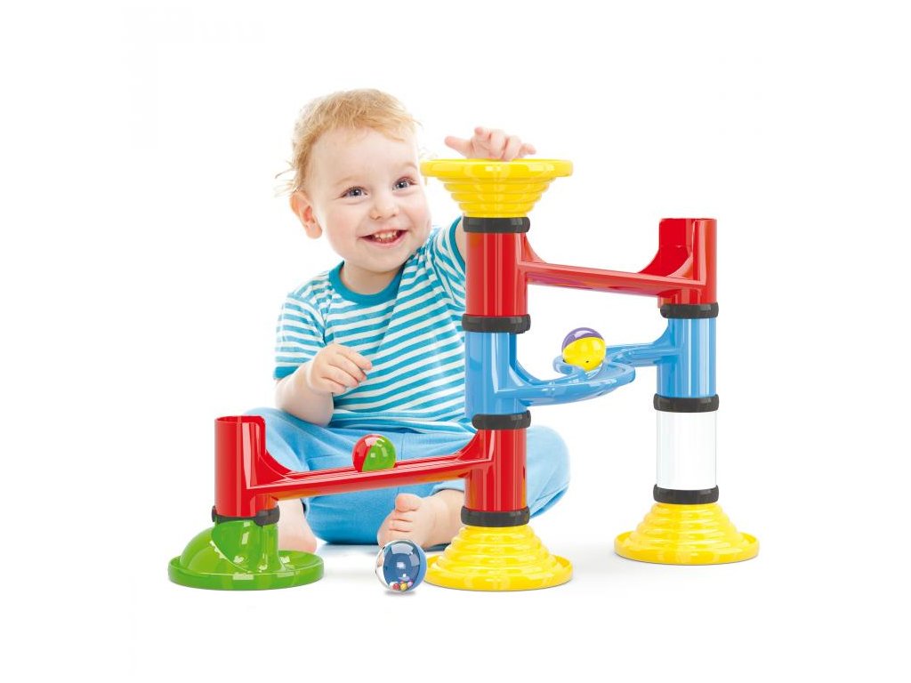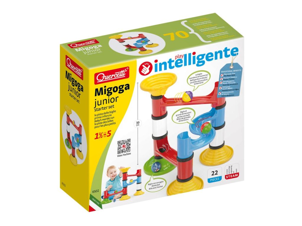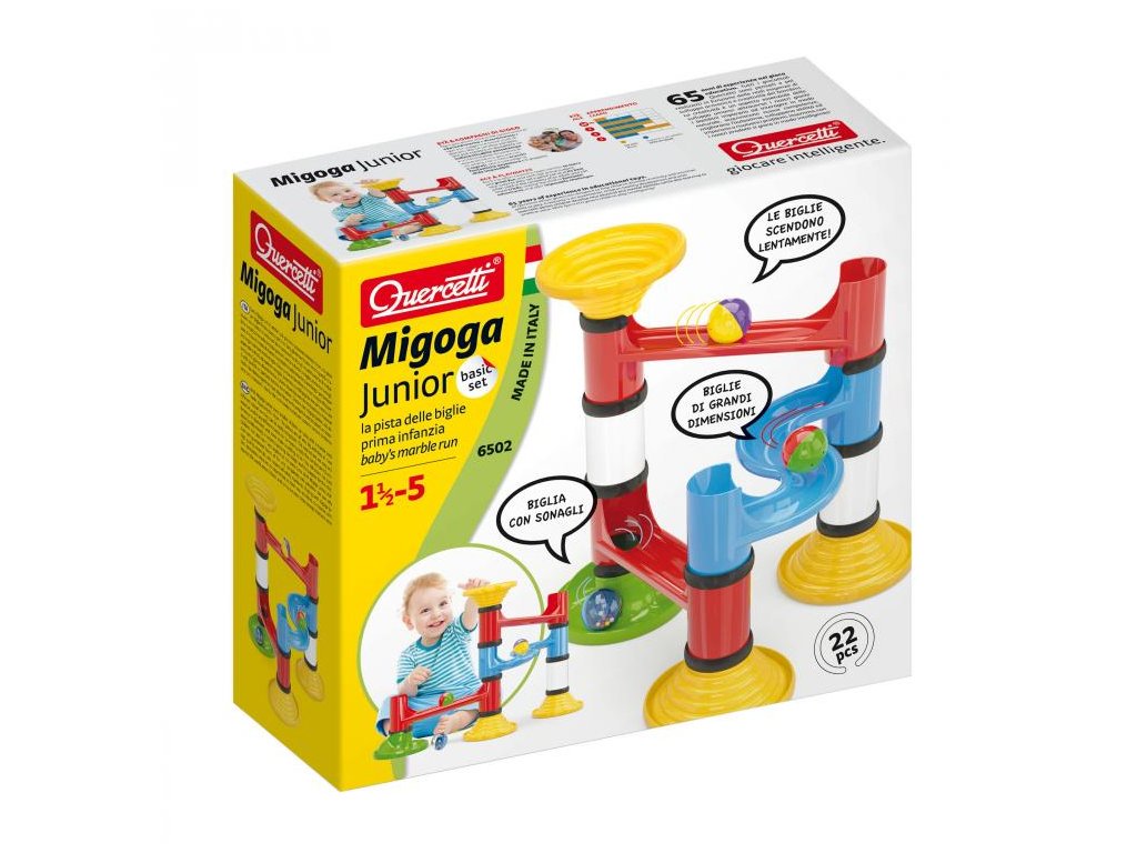 Vďaka stavebnici Migoga Junior sa aj menšie deti môžu hrať s guličkovou dráhou, ktorá bola vytvorená špeciálne pre nich. Všetky diely stavebnice sú veľké, farebné a ľahko rozpoznateľné, takže deti dokážu intuitívne a rýchlo postaviť rôzne dráhy. Guličky majú priemer 4,5 cm, niektoré pri pohybe hrkajú a kotúľajú sa pomaly, čo predlžuje chvíle očarenia a umožňuje deťom objavovať princípy pohybu a príčiny a následky.