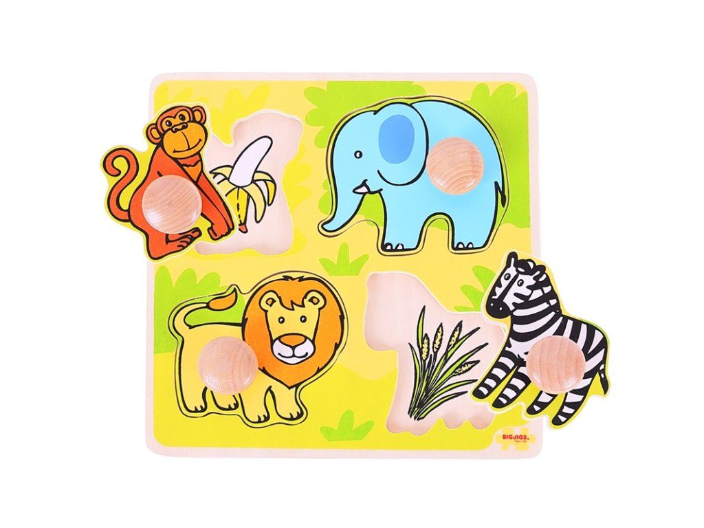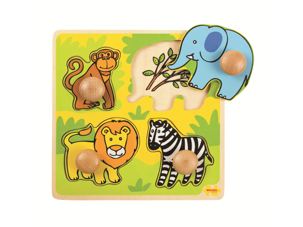 Drevené puzzle pomáha rozvíjať slovnú zásobu, keď deti pomenúvajú zvieratá, farby a tvary. Každý dielik má praktický úchyt, vďaka ktorému sa ľahko uchopuje a vkladá aj malými detskými ručičkami.