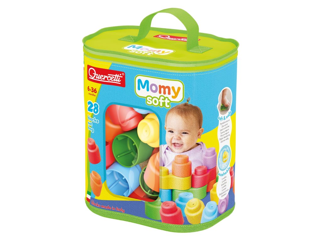 Momy Soft Bag od Quercetti je perfektná hračka pre bábätká a batoľatá vo veku 6 až 36 mesiacov. Táto sada obsahuje 28 veľkých, mäkkých a farebných blokov vyrobených z bezpečného materiálu, navrhnutých tak, aby stimulovali zmyslový, motorický a kognitívny vývoj. Každý prvok má zaoblené tvary a ľahko uchopiteľné povrchy, ideálne pre malé ručičky.