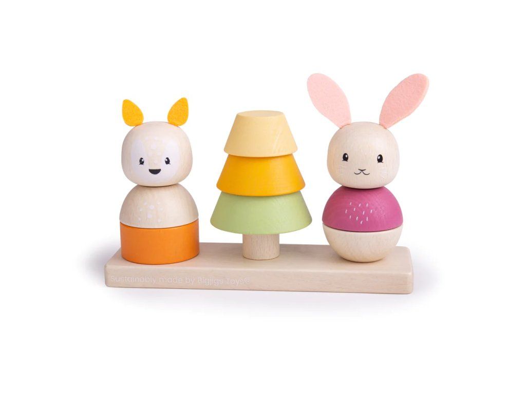 Skladajte, stavajte a hrajte sa. Táto nádherná stohovacia hračka je vyrobená z FSC dreva. Obsahuje dve lesné zvieratká – líšku a králika – a tiež stohovateľnú borovicu. Roztomilý dizajn v pastelových farbách zároveň podporuje rozvoj zručnosti a rozpoznávanie farieb.