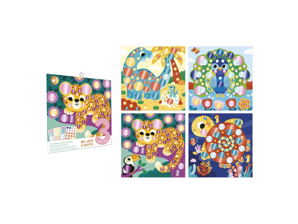 Táto tvorivá sada umožňuje deťom zdobiť obrázky zvierat pomocou kovových nálepiek v tvare bodky. Aktivita rozvíja jemnú motoriku, trpezlivosť a predstavivosť.