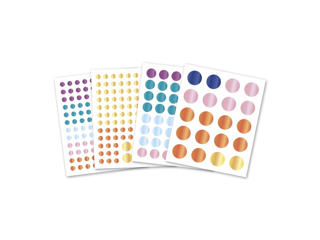 - 4 listy kovových nálepiek v tvare bodky, 3 veľkosti: 30 mm, 20 mm a 10 mm