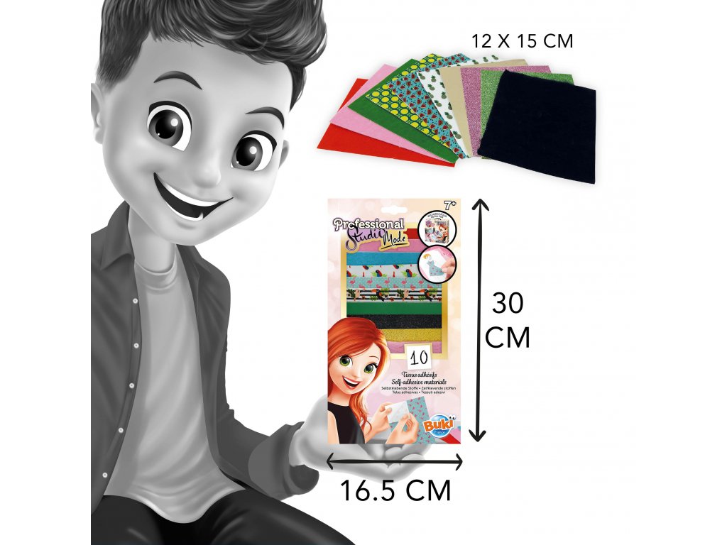 V súprave je 10 rôznych materiálov, ktoré sú vybavené lepivou vrstvou na jednej strane.