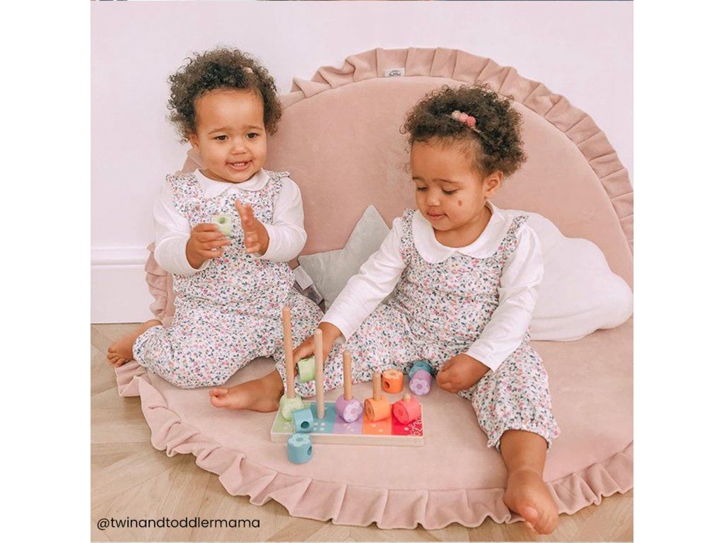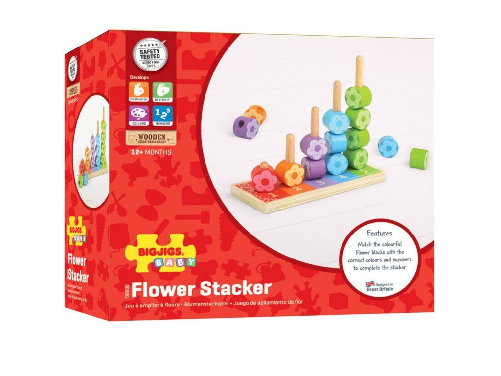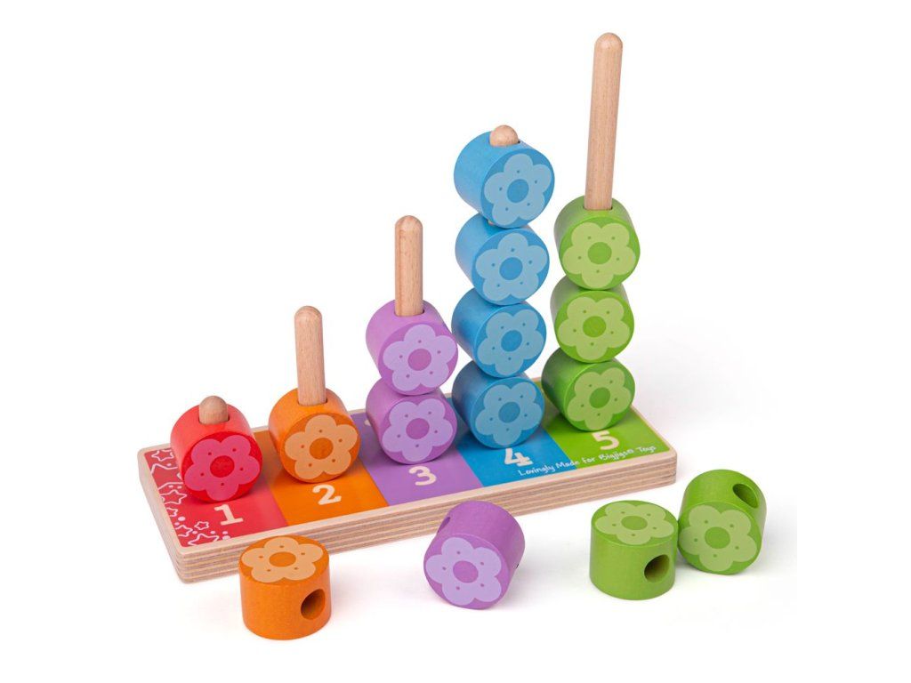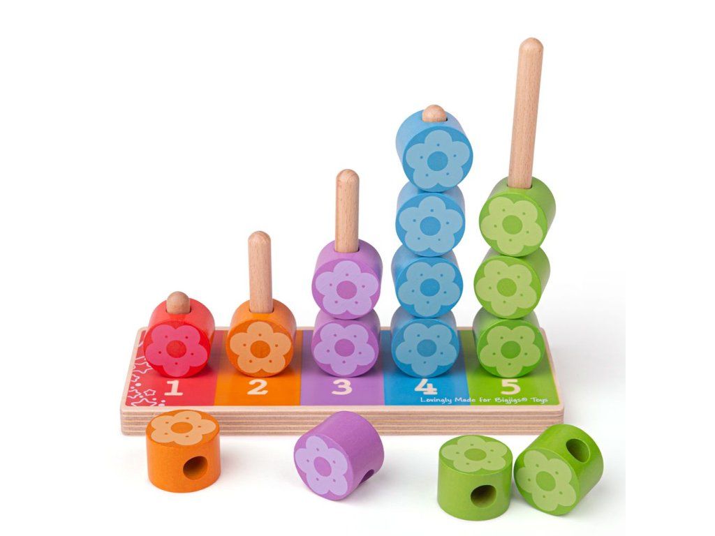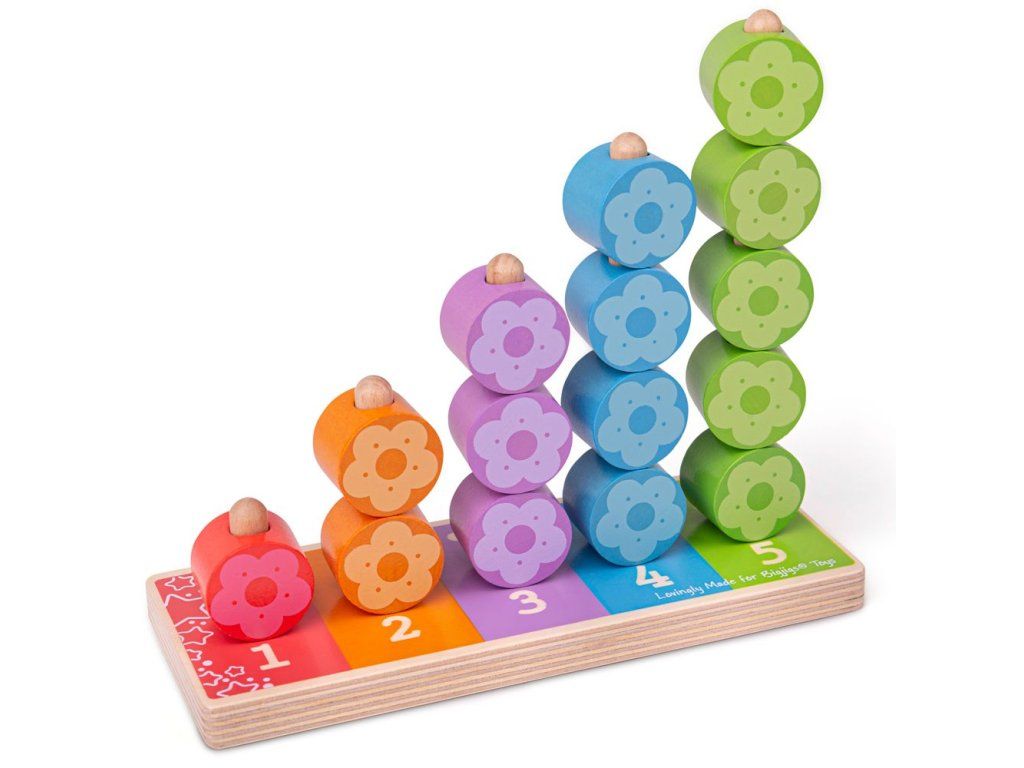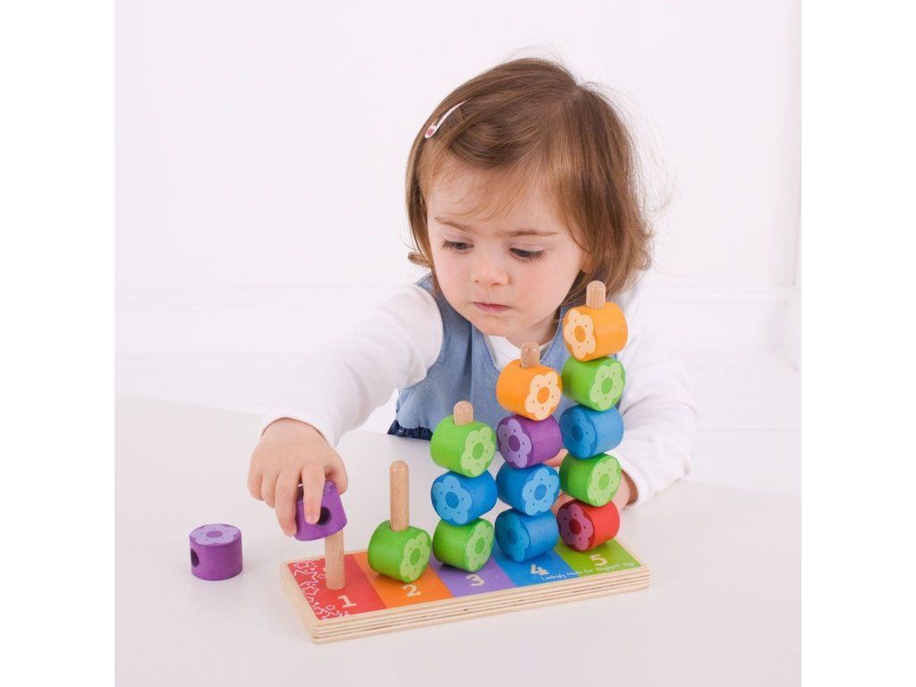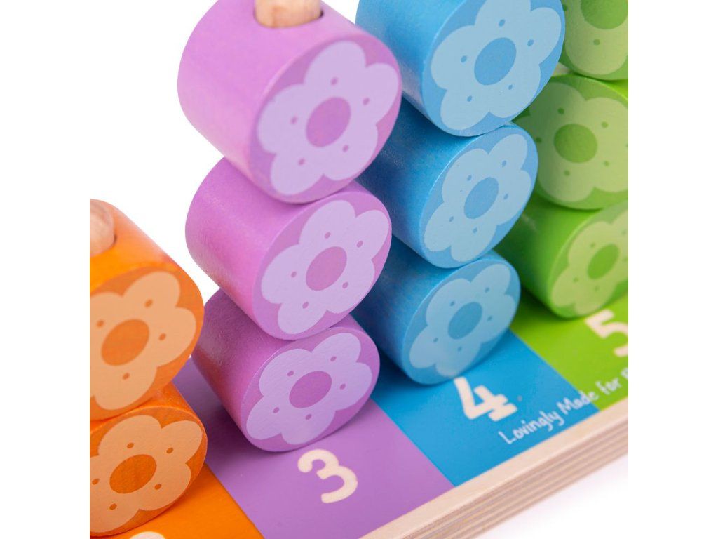 Vzdelávacie drevené nasadzovanie farebných kvetiniek pomáha dieťaťu naučiť sa hravou formou rozlišovať farby, počítať a precvičovať jemnú motoriku. Farebné kvetinky sa nasadzujú na príslušné kolíky.