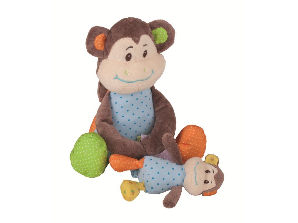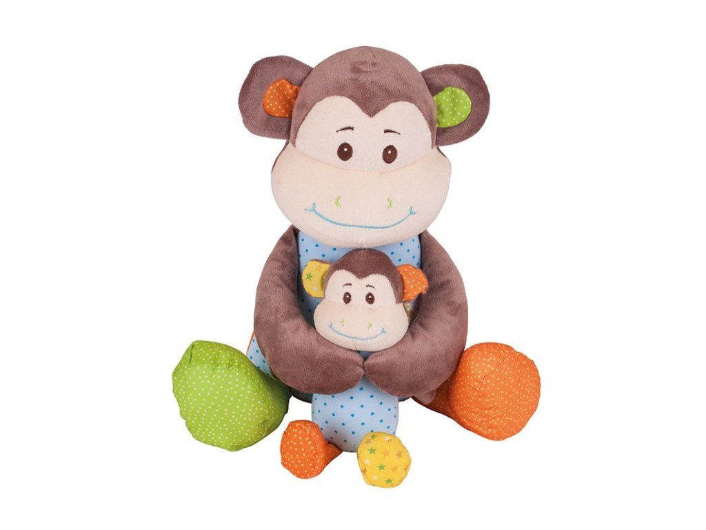 Táto drzá opička drží v náručí menšiu opičku, ktorá je odnímateľná. Sú mäkké a majú farebné telá. Opička maminka má hryzátko a hrkálku, čo pomáha rozvoju kognitívnych funkcií. Plyšová hračka deťom ponúka útechu a priateľstvo. Spĺňa európske bezpečnostné normy.