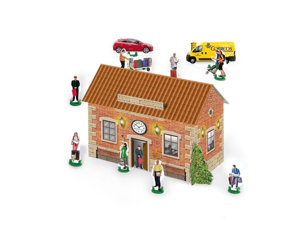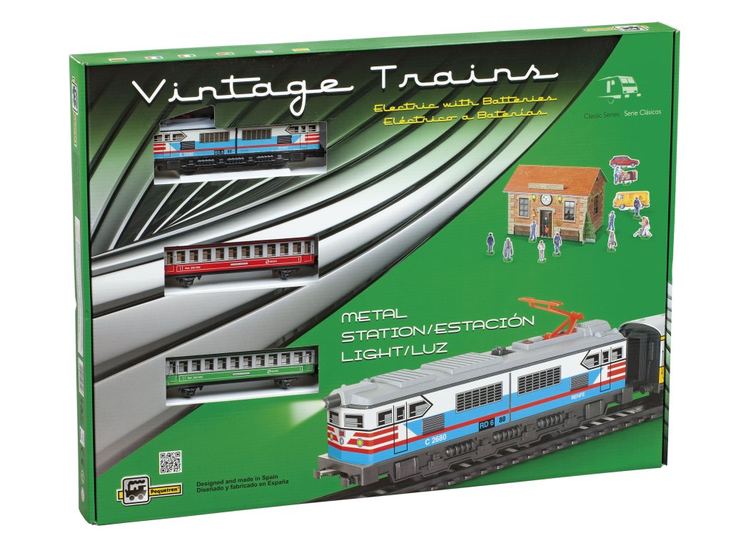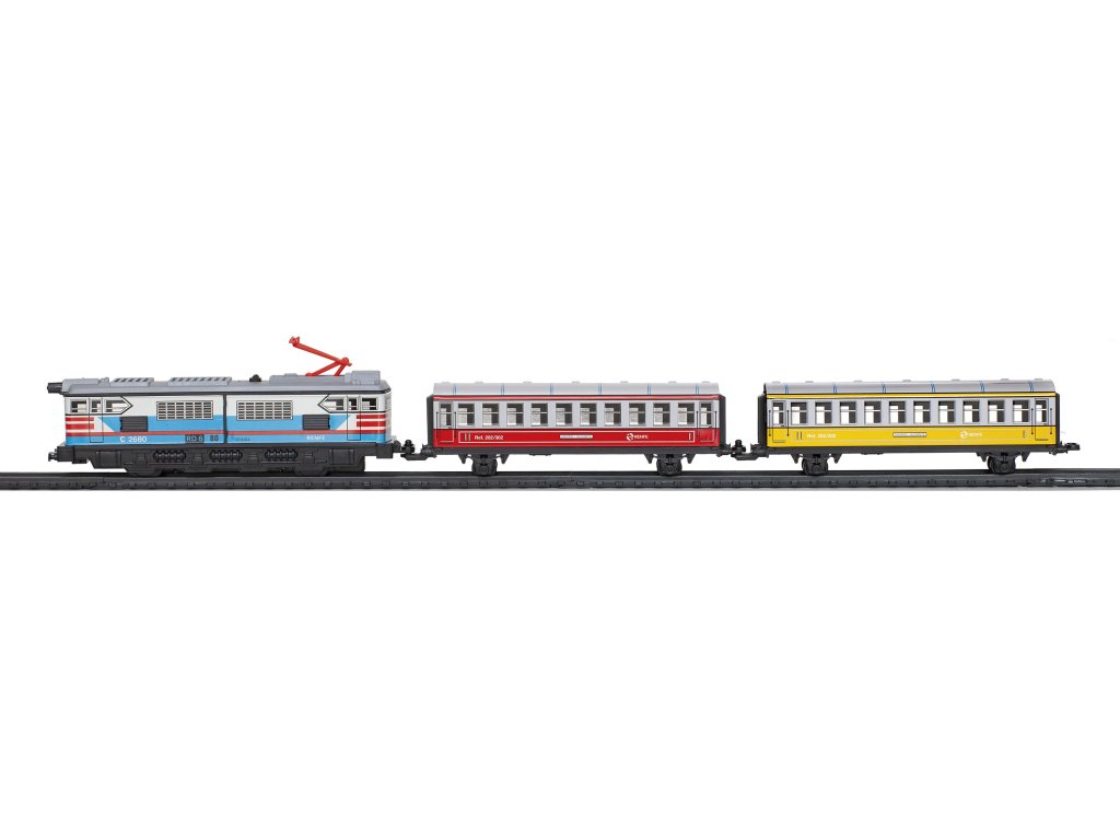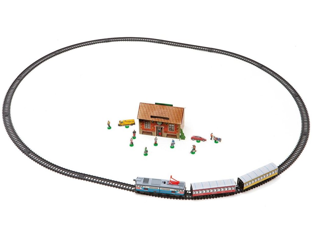 Kovový historický osobný vlak na batérie so svetlami, 2 vagónmi a železničnou stanicou, ktorý jazdí po trati dlhej 3,4 m. Tento model prináša realistický zážitok z hrania a umožňuje deťom aj zberateľom vytvoriť malú železničnú scénu doma.