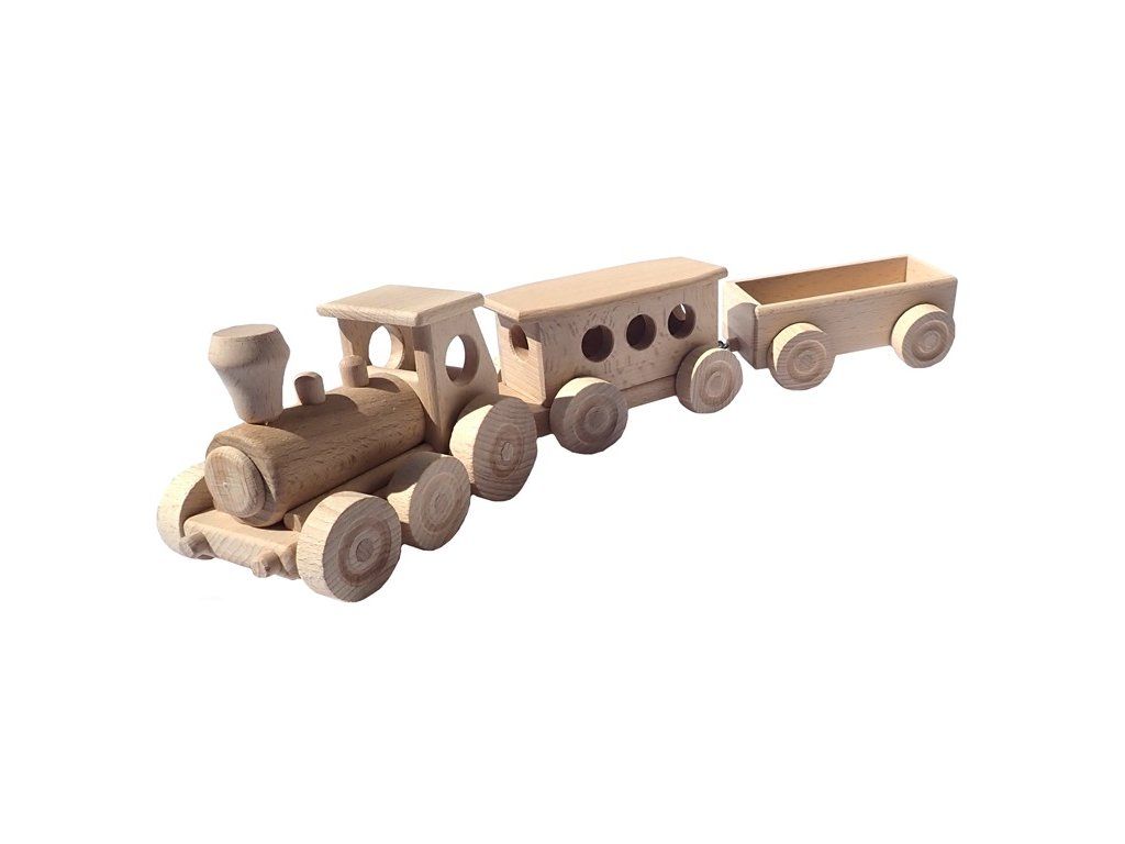 Drevený model vláčika je vyrobený z vysoko kvalitného bukového dreva. Povrch je iba voskovaný a leštený, bez chemických úprav či farbenia, aby si zachoval prirodzený vzhľad.