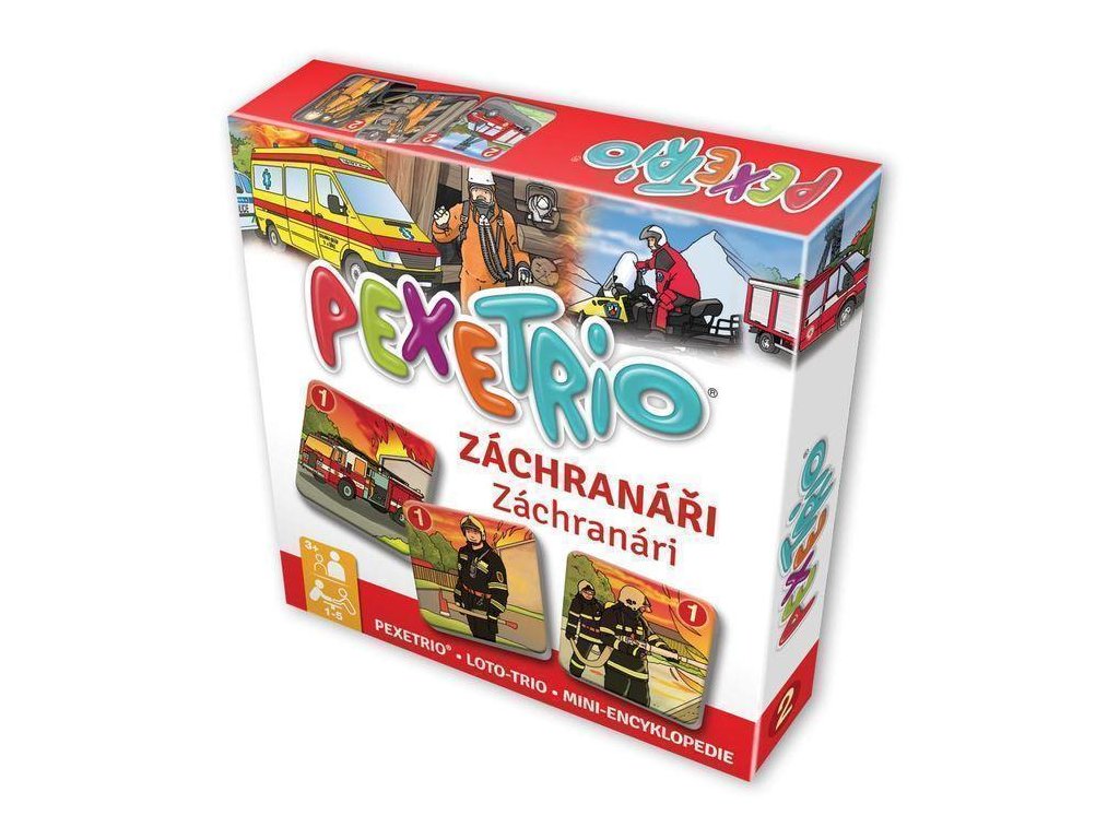 Pexetrio ZÁCHRANÁRI je zábavná a vzdelávacia hra inšpirovaná pexesom, ktorá učí deti spoznávať záchranárske profesie, rozoznať typické odevy, techniku a nástroje podľa hesla „škola hrou“.