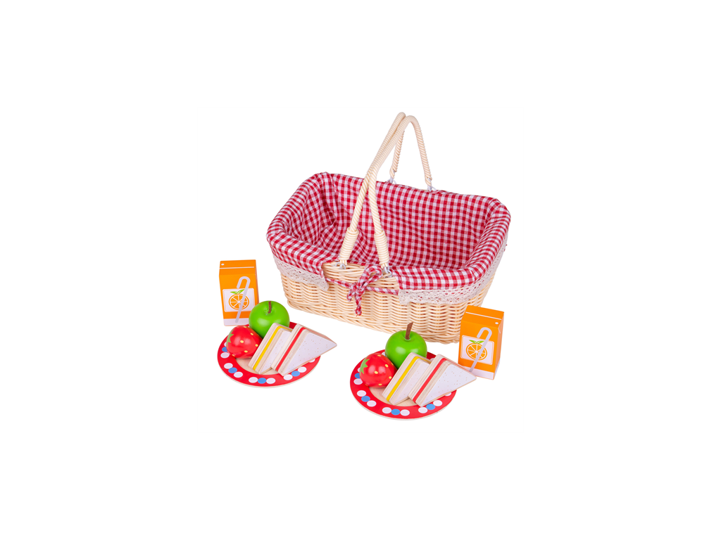 Obsahuje drevené sendviče, jahody, jablká a pomarančové džúsy. Prútený košík obsahuje aj tanieriky a deku na piknik. Deti si tak môžu užiť piknik so svojimi plyšákmi alebo vyraziť do parku s rodinou a priateľmi.