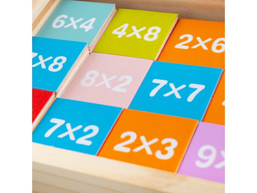 Pestrofarebné drevené dieliky s kombináciou malej násobilky.
