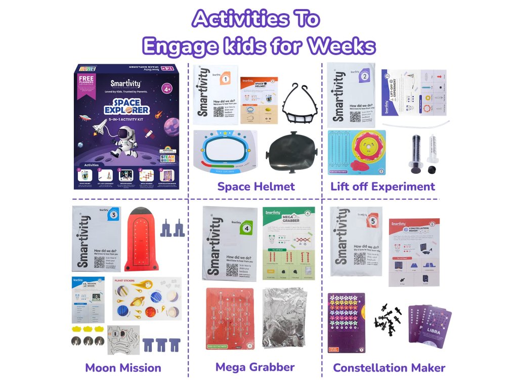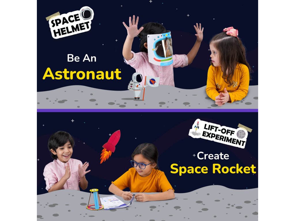 Prieskumník vesmíru je vzdelávacia aktivita v jednom boxe, ktorá prináša fascinujúci pohľad na náš vesmír a zároveň učí deti cez hru a tvorenie. Tento multifunkčný set obsahuje až 5 rôznych experimentov a stavebných projektov, ktoré deti zavedú od štartu rakety až po tvorbu vlastných hviezd.