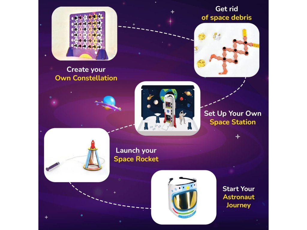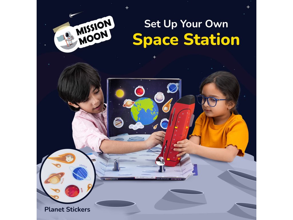 Deti si postupne zostavia model rakety, vesmírnu helmu, jednoduchý teleskop a ďalšie kreatívne prvky, ktoré podporujú ich zvedavosť a technické myslenie. Hra je navrhnutá tak, aby stimulovala predstavivosť a zároveň rozvíjala dôležité motorické a kognitívne schopnosti bez potreby batérií či obrazoviek – ideálne pre kreatívnu, „screen-free“ zábavu.