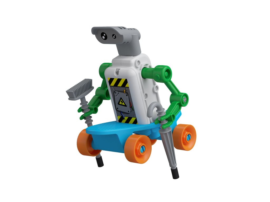 Je zábavné sledovať , ako tento malý robot zdí na skateboarde podľa toho, ako ste mu na stavili ramneá! Deti vo veku 8 až 12 rokov dokážu jednotlivé robota časti rýchlo zacvaknúť, vložiť motor a umiestniť batérie do priehradky. Návod ukáže, ako na to. S rôznymi nastaveniami výšky ramien je cesta na skateboarde vždy iná.