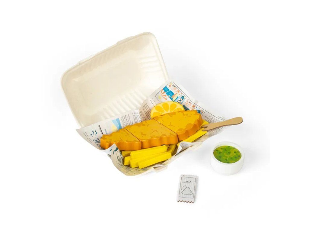 Ryba je rozdělena na tři části, takže ji děti mohou pomocí vidličky „nakrájet“. Hraní na role s dřevěnými potravinami podporuje komunikaci, spolupráci a sociální interakci – děti mohou přijímat objednávky, obsluhovat zákazníky alebo si uavžívať spoločné stolovanie.