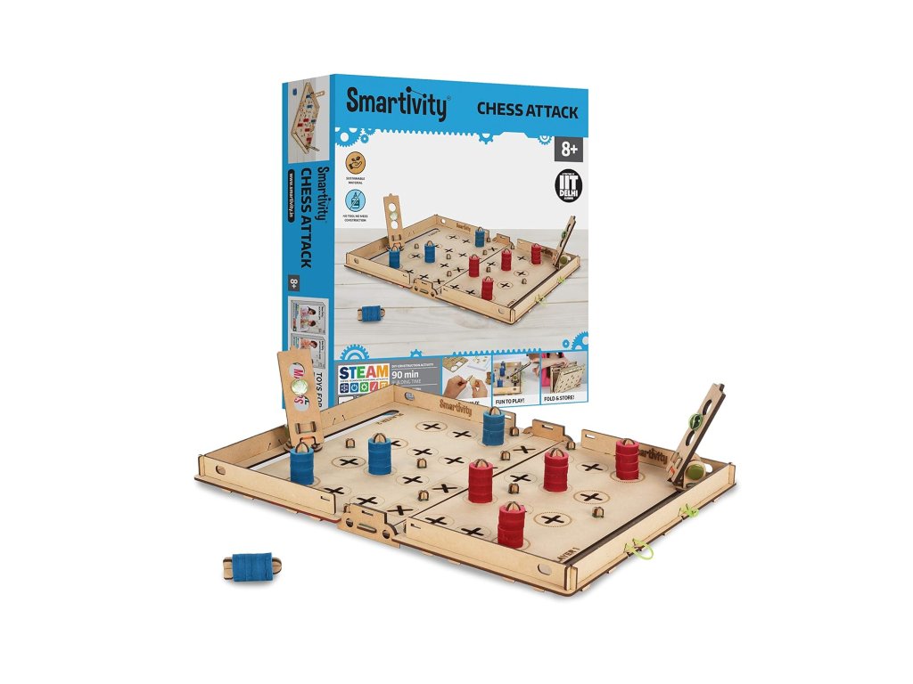 Smartivity SMRT1011 – Šachový útok je originálna drevená stavebnica a strategická hra pre dvoch hráčov, ktorá kombinuje logické myslenie, taktiku a presnú mušku. Najskôr si hru zostavíš – a potom sa môže začať súboj mozgov aj nervov.