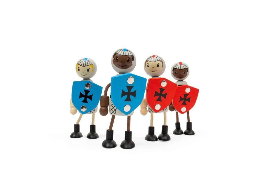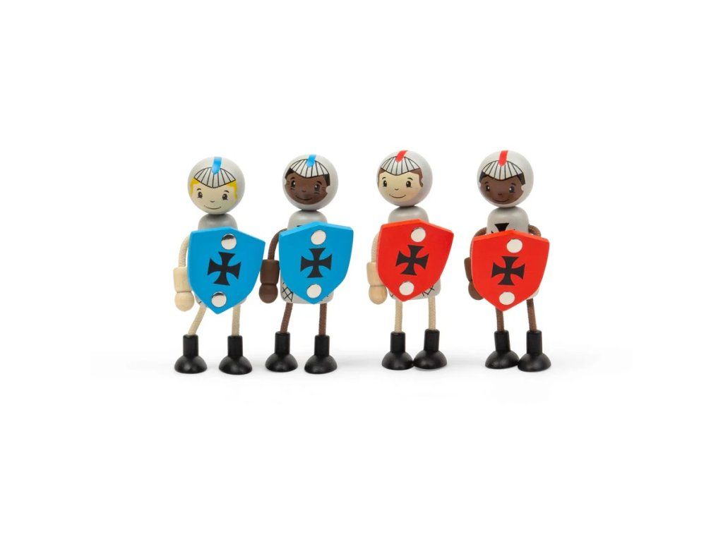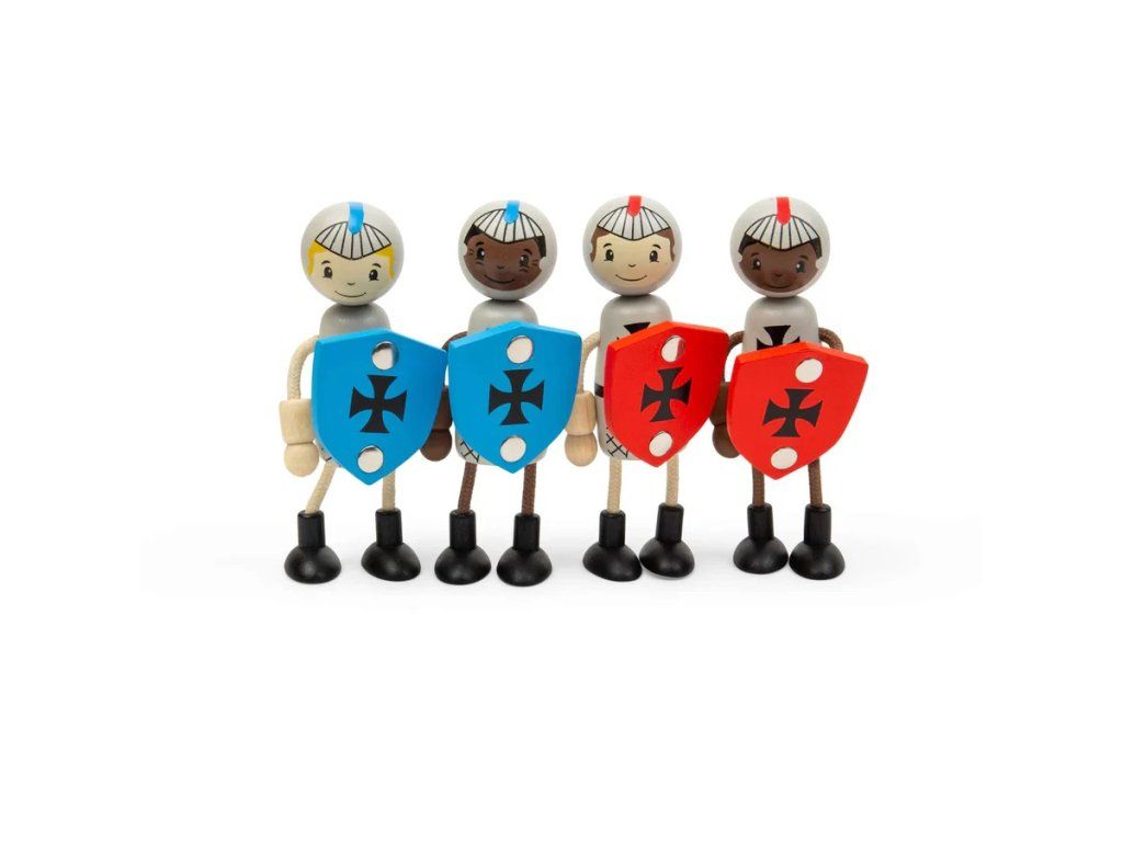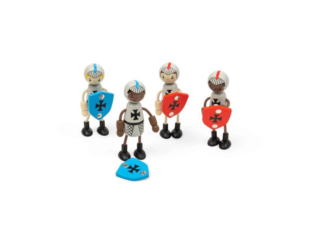 Táto drevená sada prináša štyroch statočných rytierov pripravených chrániť hrad a prežiť každé dobrodružstvo, ktoré si deti vymyslia.
