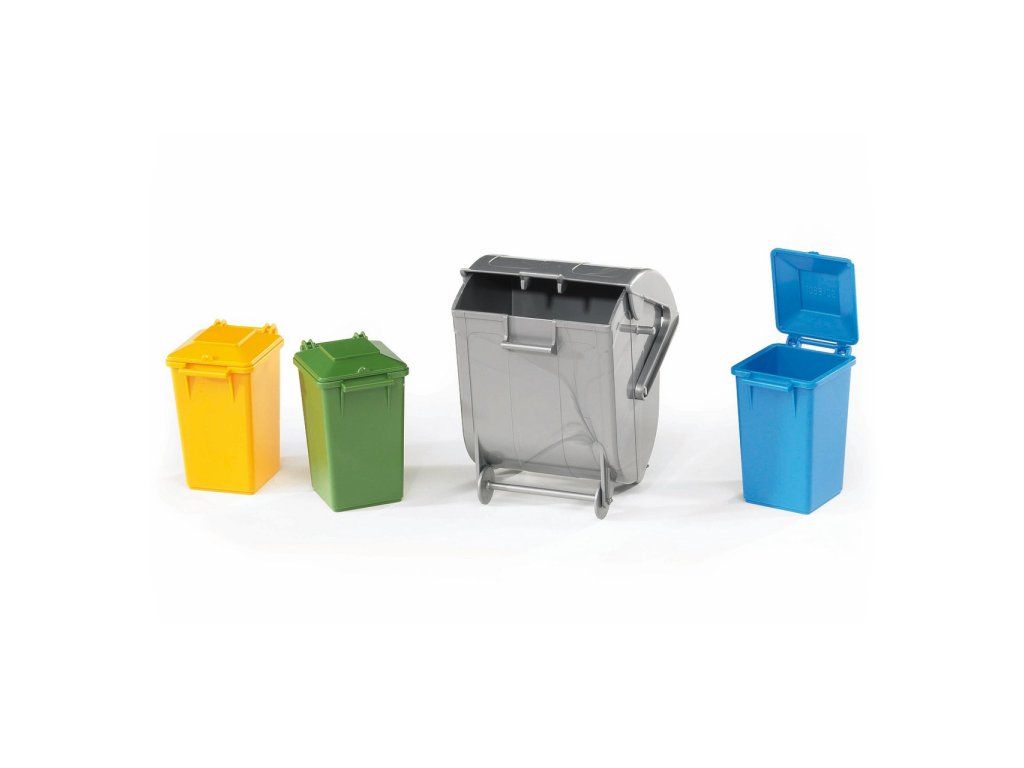 Verná kópia plastových smetných nádob a kontajnera. Vhodný doplnok ku všetkým smetiarskym vozidlám MAN, MERCEDES BENZ Arocs a MACK Granite. Balenie obsahuje 3 náhradné malé smetné nádoby a 1 veľký kontajner. Vyrobené v Nemecku z kvalitných materiálov.