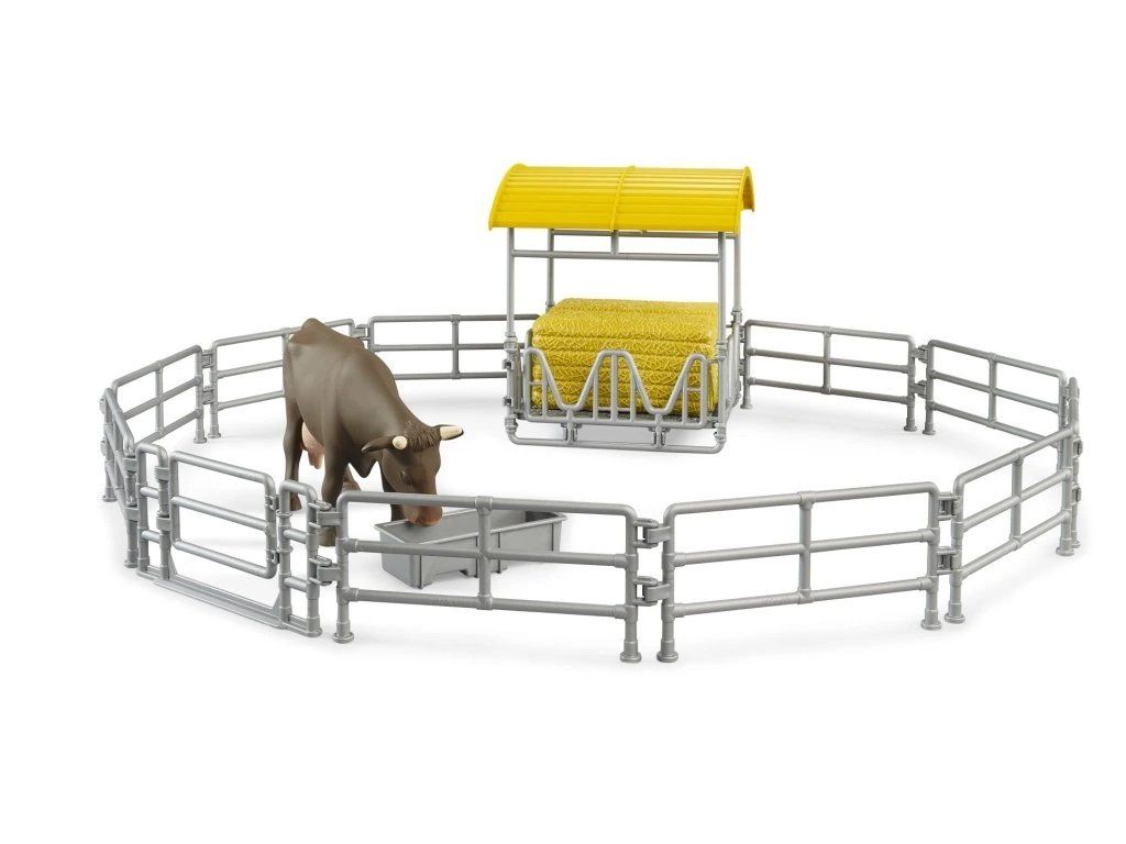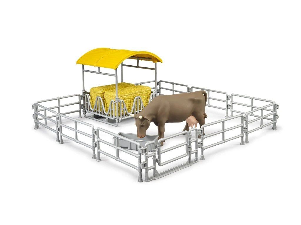 Súčasťou setu je senník s úložným priestorom na seno, ohrady na vymedzenie priestoru a kŕmidlo, ktoré umožňuje realistickú hru pri kŕmení zvierat. Nechýba ani figúrka kravy, ktorá dotvára autentickú farmársku atmosféru. Jednotlivé prvky je možné variabilne usporiadať a kombinovať s ďalšími setmi BRUDER, čo rozširuje možnosti hry.