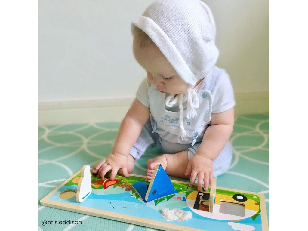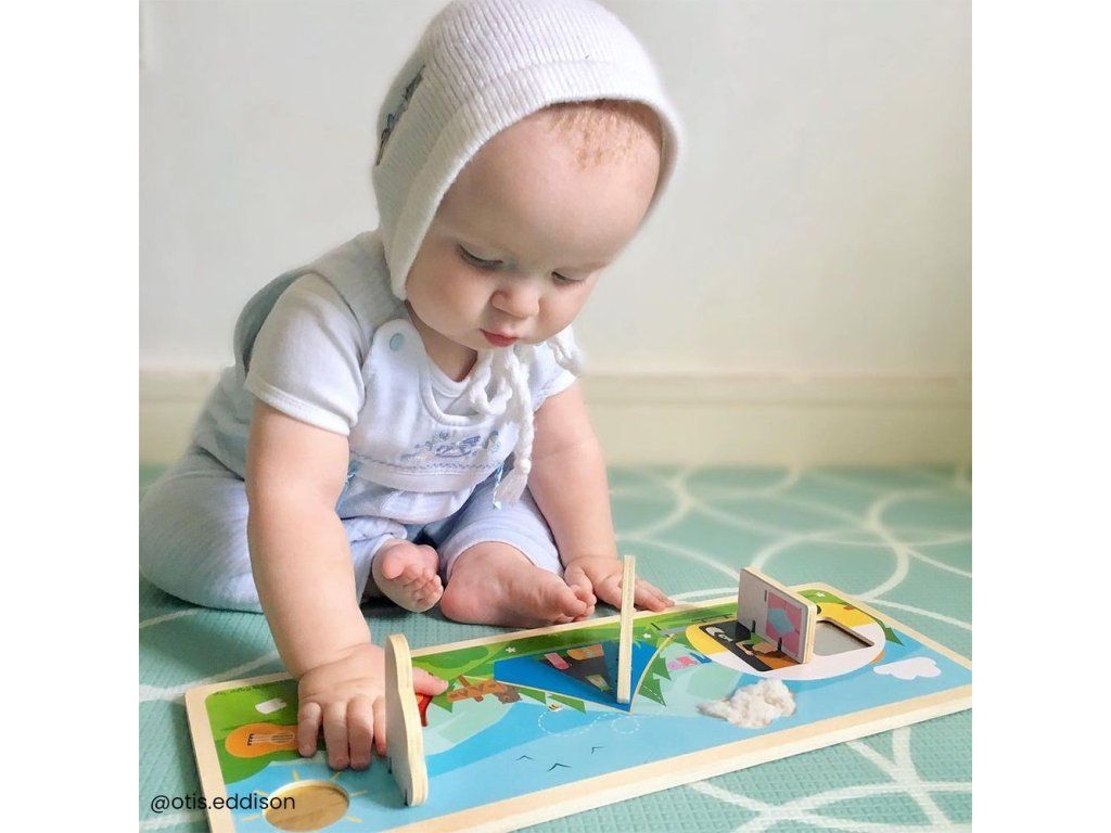 Podporte tých najmenších, aby objavovali zrakom a dotykom drevenú senzorickú scénu.
