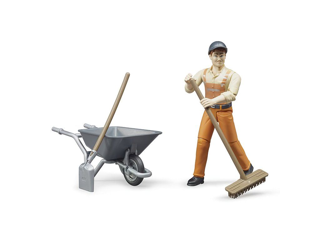 Vďaka pohyblivým končatinám môže figúrka uchopiť rôzne náradie značky Bruder, ako je fúrik, metla a lopata, ktoré sú súčasťou tejto sady.