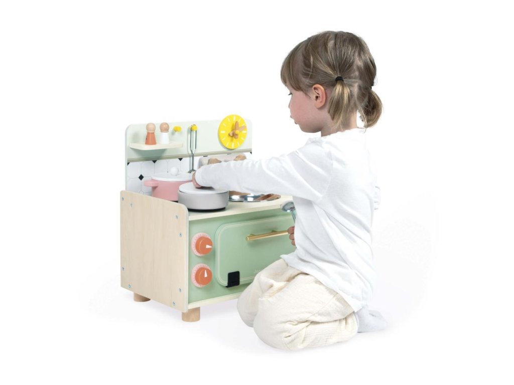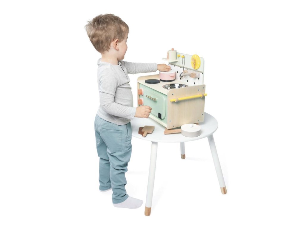 Je čas jesť, takže je čas pripraviť si chutné jedlo! Deti od 3 rokov si môžu so svojou drevenou kuchynkou predstavovať bláznivé príbehy pri sporáku a napodobňovať dospelých. Kuchynka je vybavená ako skutočná a obsahuje 9 doplnkov, vďaka čomu je ideálna na hranie sa a vymýšľanie rôznych receptov.