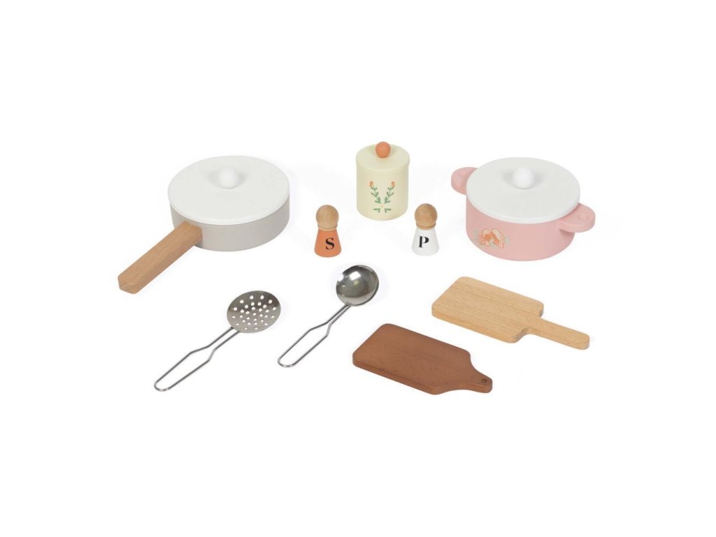 - 9 doplnkov: 2 dosky na krájanie, 1 panvica, 1 hrniec, 1 naberačka s dierkami, 1 naberačka, soľnička a korenička, 1 nádoba na cukor
