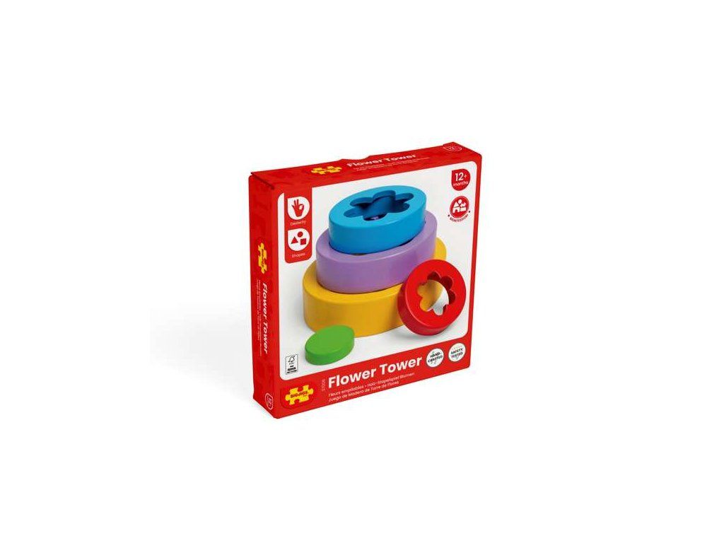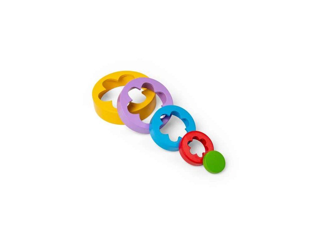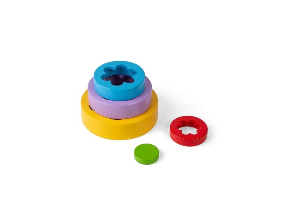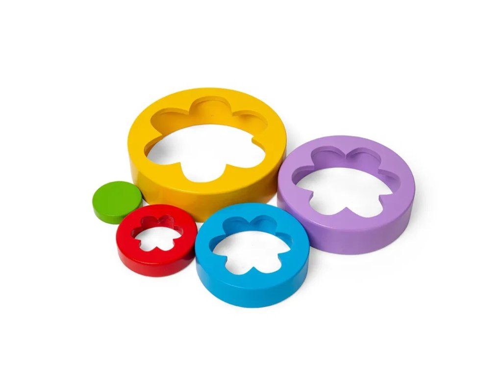 Hračka s pestrofarebnými dielmi v rôznych veľkostiach.Okúzľujúca stohovacia hračka s kvetinovým vzorom. Naskladajte 5 dielov v tvare kvetu na seba a vytvorte vežu, alebo ich zasuňte do seba a vytvorte krásny farebný kvetinový vzor. Experimentovanie s rôznymi spôsobmi skladania a učenie sa, ako sa dieliky zasúvajú do seba, podporuje kognitívny rozvoj dieťaťa, schopnosti riešenia problémov, zručnosť a koordináciu ruka–oko.