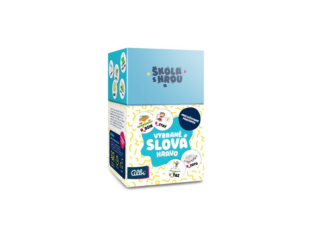 Súprava Vybrané slová hravo z edície Škola s hrou obsahuje 200 kusov obojstranných žetónov na hravé precvičovanie pravopisu vybraných slov.