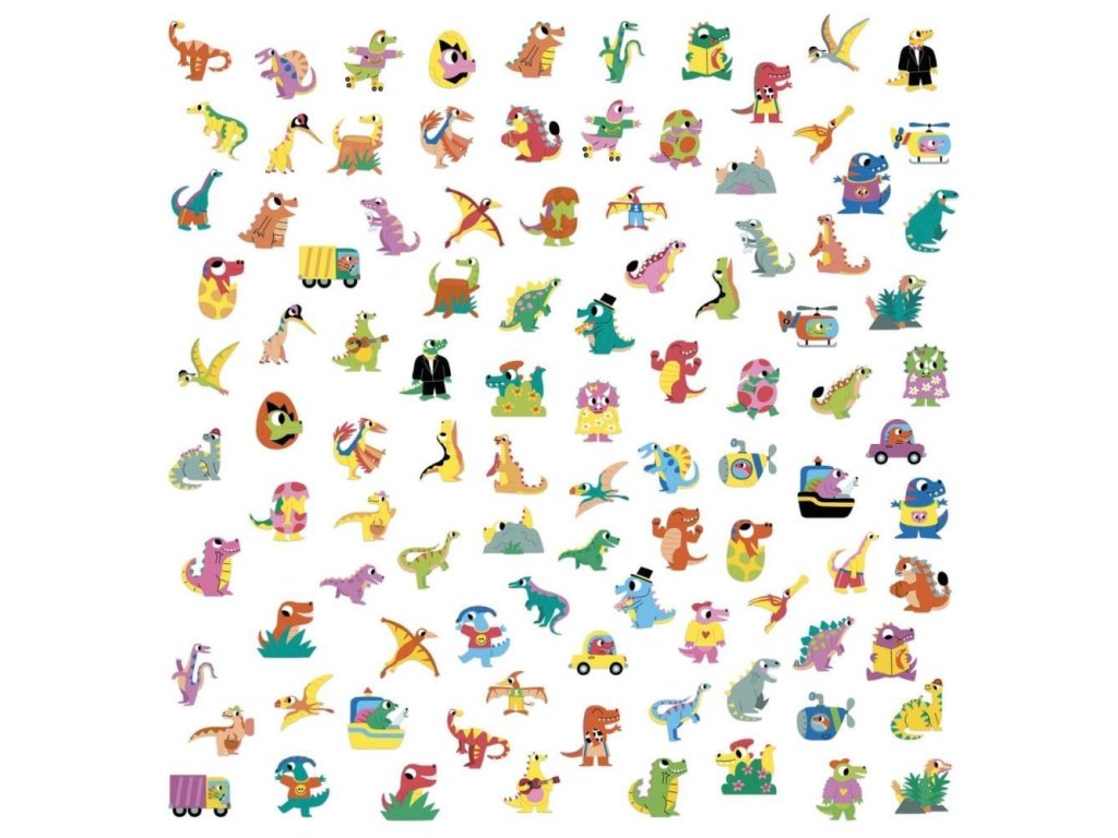 Sada samolepiek Dinosaury obsahuje 100 vyrezaných po obryse opakovane použiteľných samolepiek.