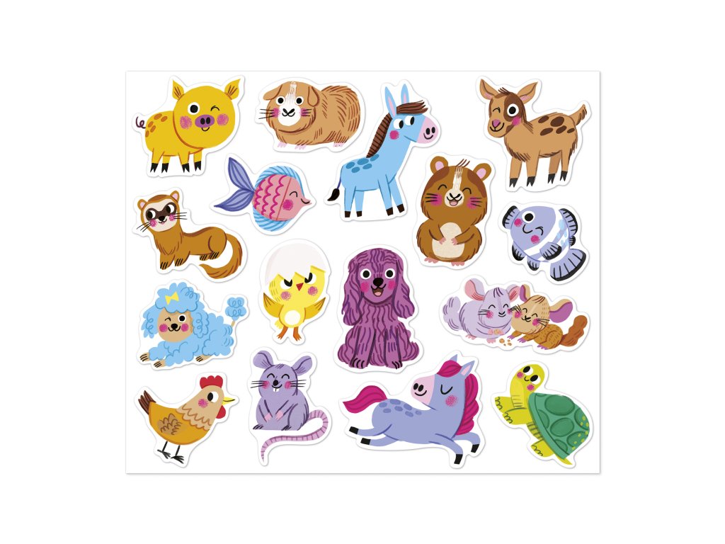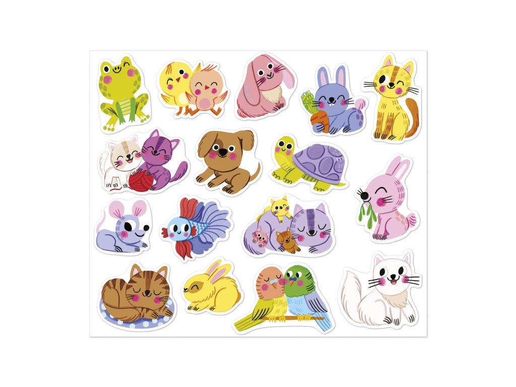 Knižka obsahuje celkovo 100 veľkých nálepiek s tematikou domácich miláčikov, rozložených na 6 listoch, každý s 16 nálepkami. Nálepky sú bez orezávania, ľahko sa uchopia a perfektne pasujú na listy. Veľkosť listov (20 x 17 cm) je špeciálne navrhnutá pre ruky detí od 18 mesiacov a viac.