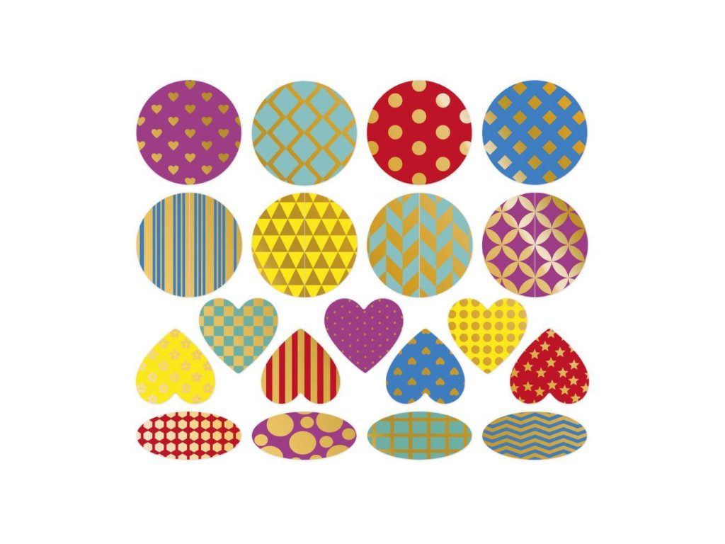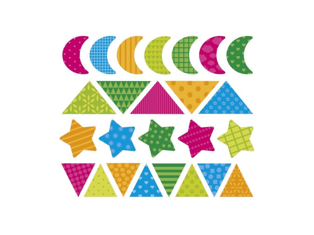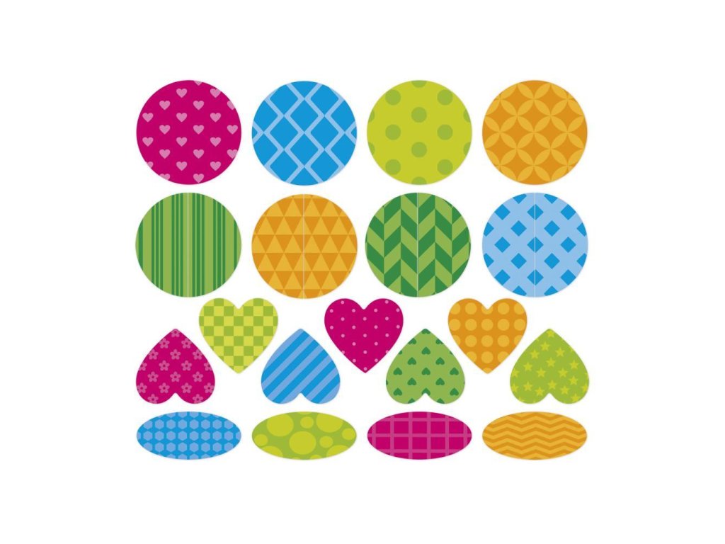 Sada nálepiek Geometrické tvary francúzskej značky JANOD obsahuje 150 veľkých opakovane použiteľných nálepiek rozmiestnených na 6 hárkoch.