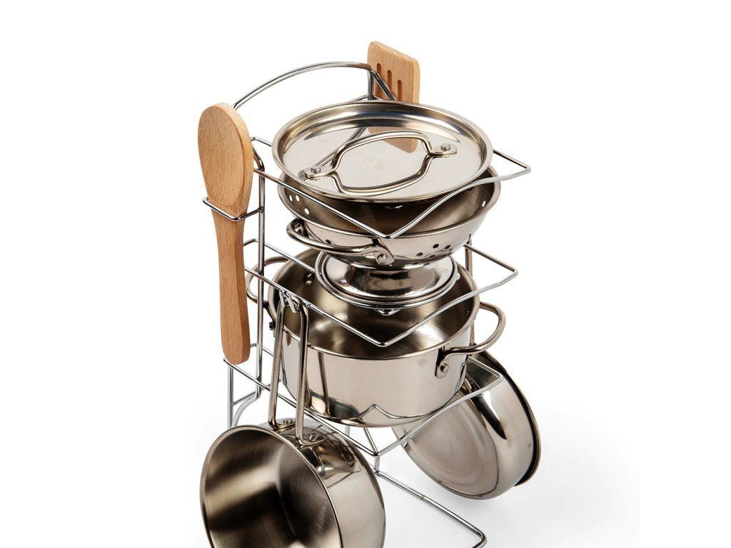 Realistická hračka obsahuje oceľový cedník, panvicu a dva hrnce, ako aj drevenú varešku a obracačku, všetko na praktickom stojane.