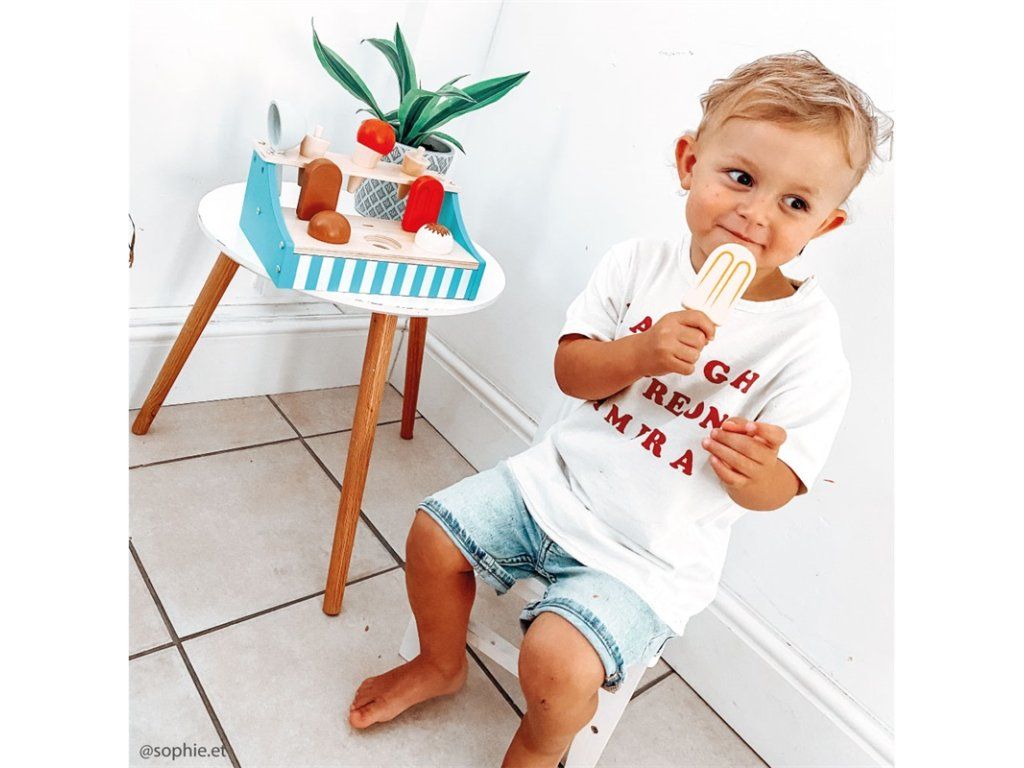 Sada obsahuje 6 rôznych druhov zmrzlín a nanukov a dodáva sa v drevenom stojane, ideálnom napríklad do detského „obchodu“.