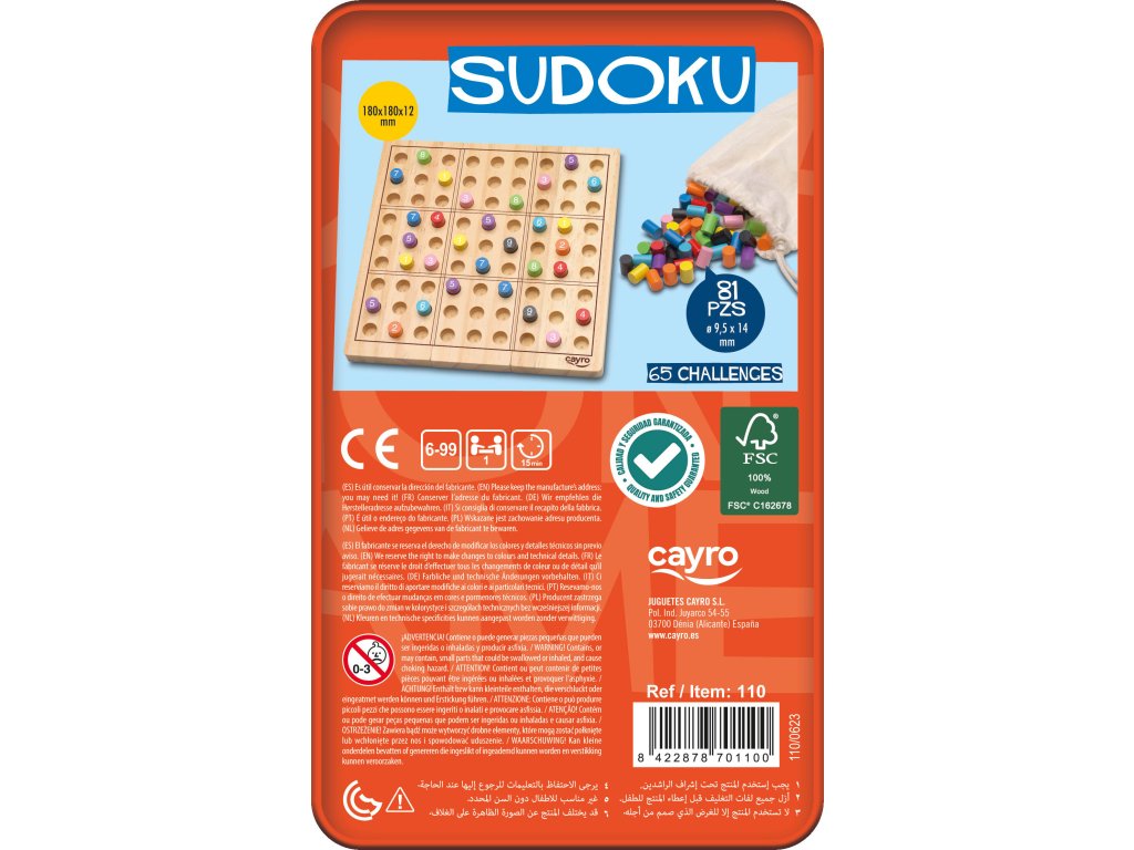Sudoku Metal Box pozostáva z 3 magnetických drevených doštičiek, ktoré do seba presne zapadajú. Súčasťou balenia sú aj farebné číslice od 1 do 9 uložené v látkovom vrecúšku, vďaka ktorému sa vám jednotlivé dieliky počas cestovania nestratia. Celá hra je uložená v pevnej kovovej krabičke, ktorá ju spoľahlivo ochráni na cestách.