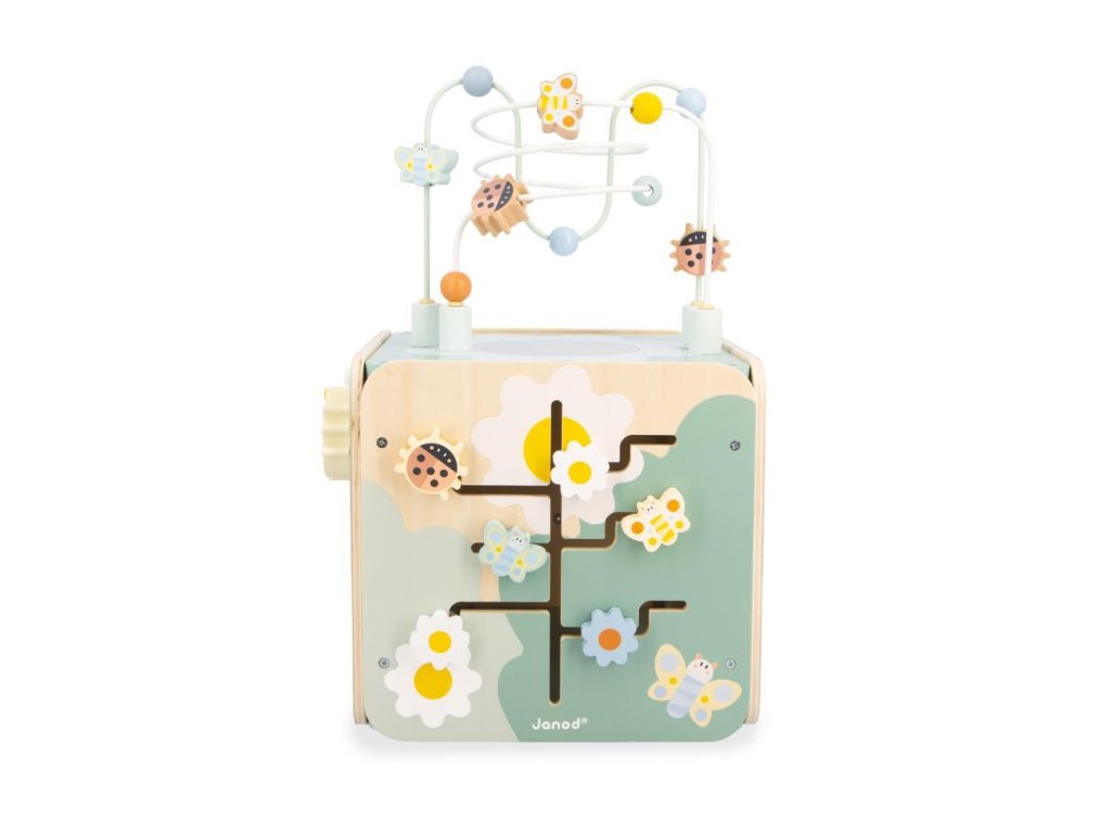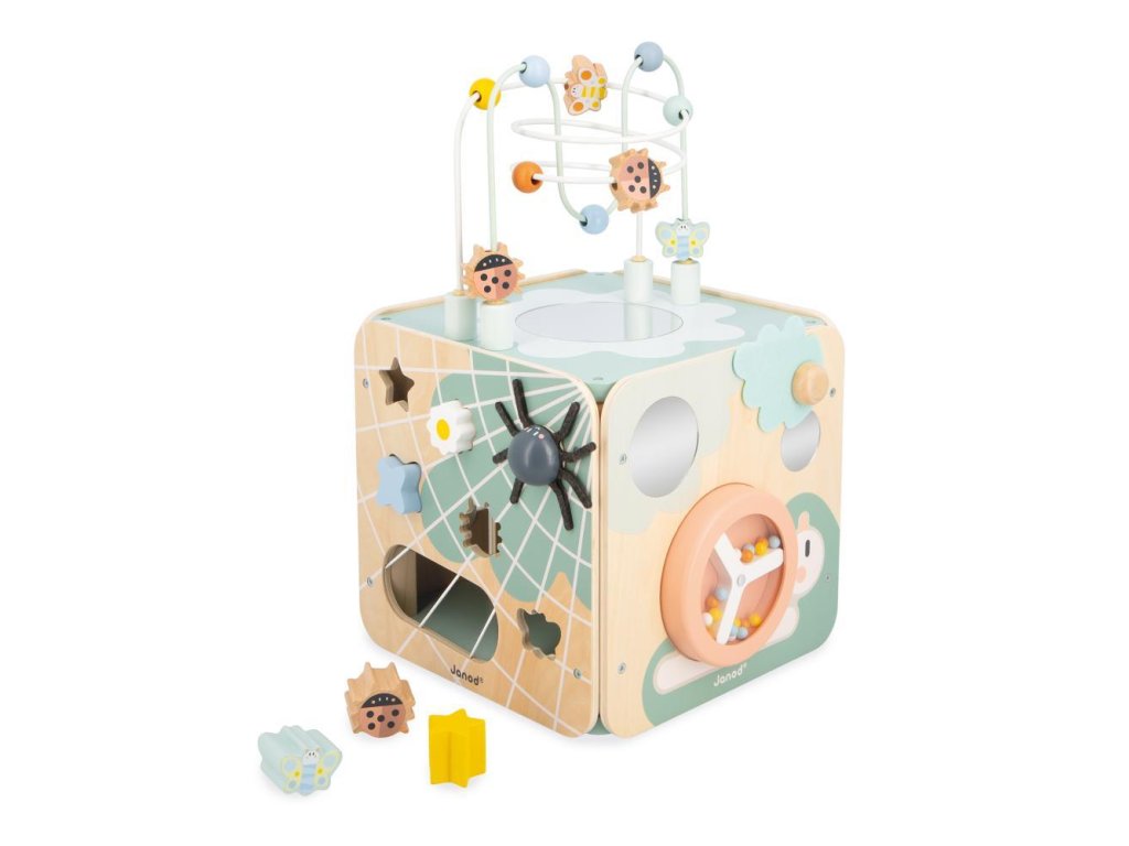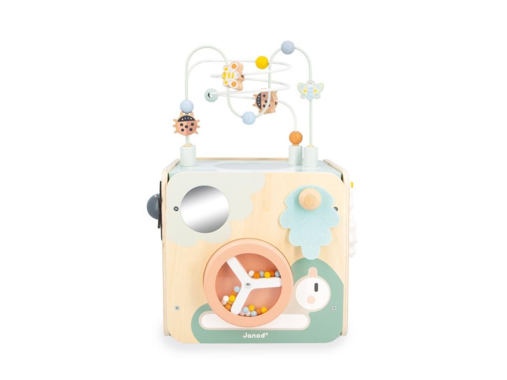 Pestrofarebná drevená multifunkčná kocka MultiActivity Janod so slučkovacím labyrintom a ďalších 8 vzdelávacích aktivít k tomu.