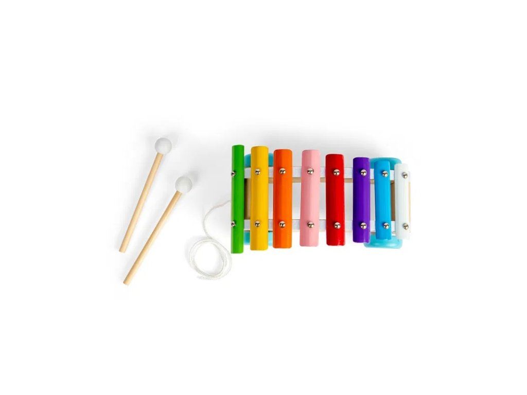 2 drevené paličky, 8 farebných klávesov a 4 drevené kolieska umožňujú deťom vytvárať hudbu kdekoľvek. Vďaka praktickej šnúrke môže slúžiť aj ako ťahacia hračka.