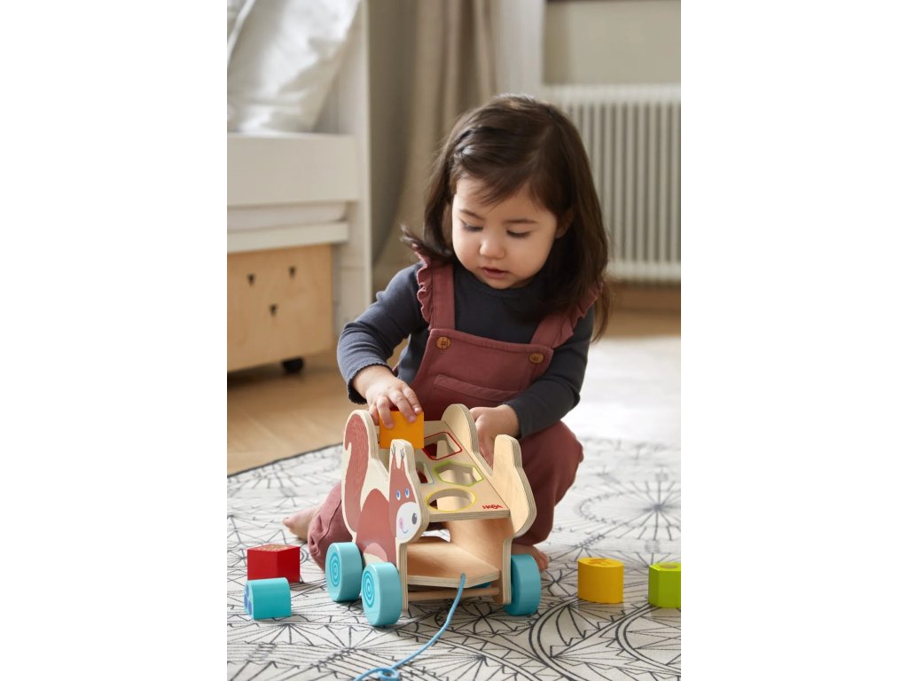 Ťahacia hračka a vkladačka v jednom pre deti od 1. roka. Nakŕmte drevenú veveričku maškrtami a vydajte sa spolu na prechádzku! Hračka obsahuje 5 drevených kočiarov, ktoré sa dajú vložiť do správnych otvorov.