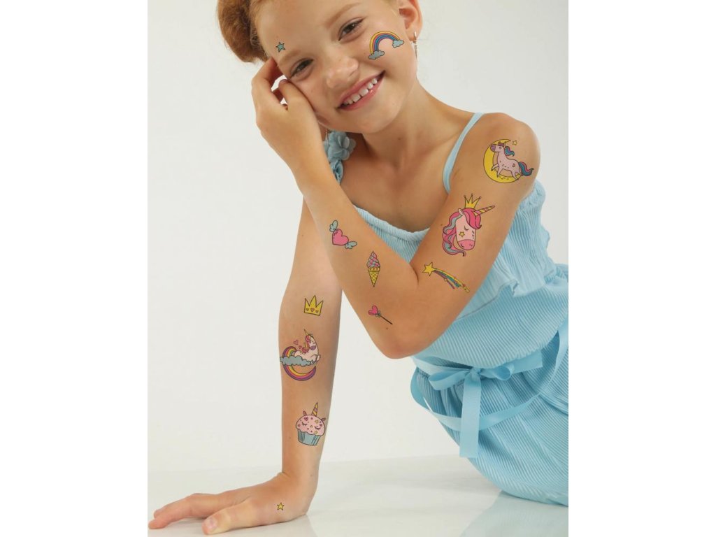 Čo potrebujú malé princezné, aby vládli svojmu kráľovstvu? Zmrzlina, muffiny, magické jednorožce, dúha. Náš mix dočasných tetovaní Jednorožce má všetko. Vystrihnite, zmiešajte a natetujte tetovania na telo v akomkoľvek množstve.