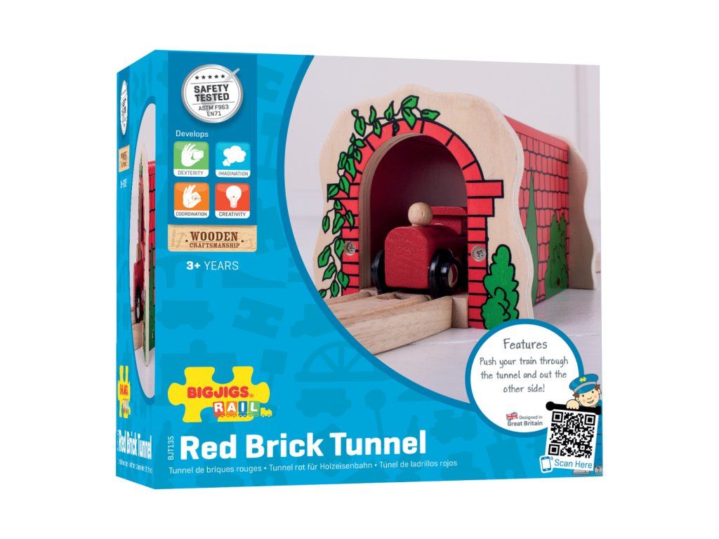 Drevený dvojitý železničný tunel z červených tehál s vysoko kvalitným povrchom je skvelým rozšírením každej vláčikovej dráhy.