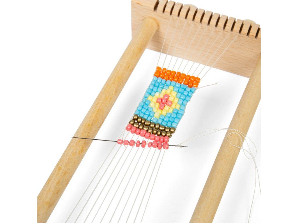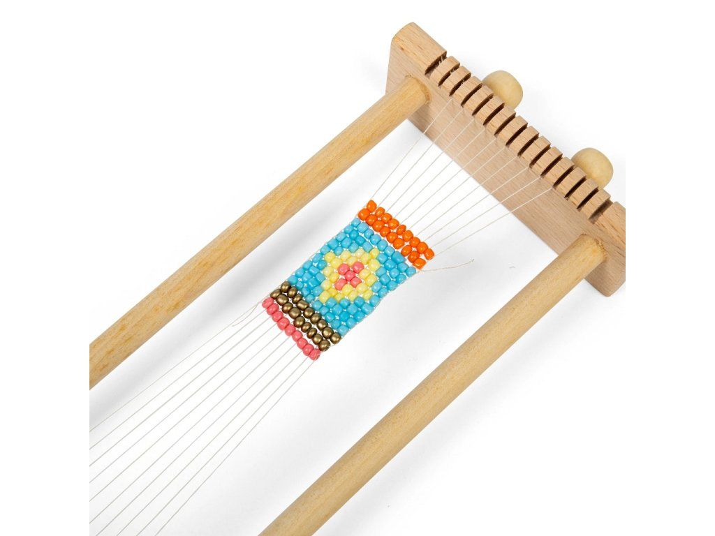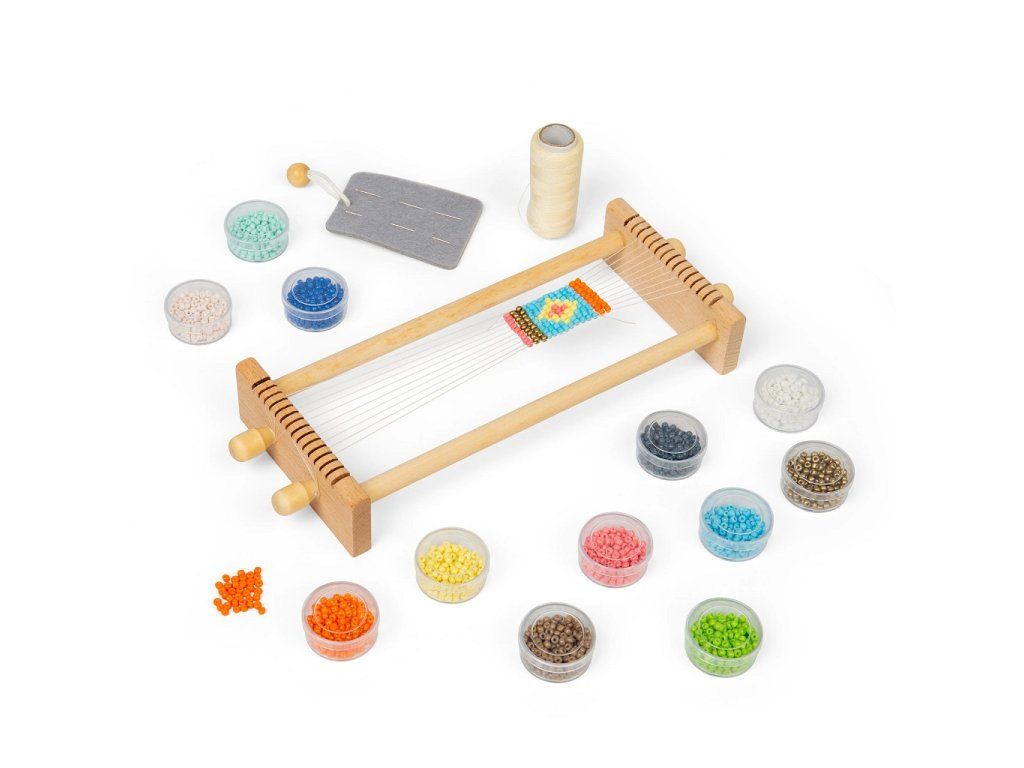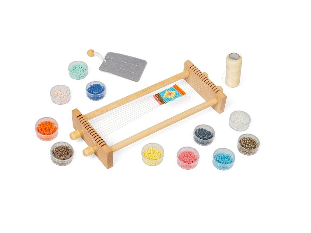 Kreatívna mládež si zamiluje tento tradičný drevený tkáčsky stav na korálky. Vyrobte si svoje jedinečné šperky alebo dekoratívne vzory. Na výber je 12 farieb korálok. Drevený tkáčsky stav je robustný a zároveň ideálnej veľkosti pre malé rúčky. Pomáha rozvíjať jemnú motoriku, kreativitu, sústredenie a trpezlivosť. Stav je vyrobený z dreva s certifikáciou FSC®. Spĺňa všetky aktuálne európske bezpečnostné normy. Dodáva sa so všetkým, čo vaše šikovné dieťa potrebuje – ihly na korálky, plstený ihlík, bavlnka, korálky aj podrobný návod.