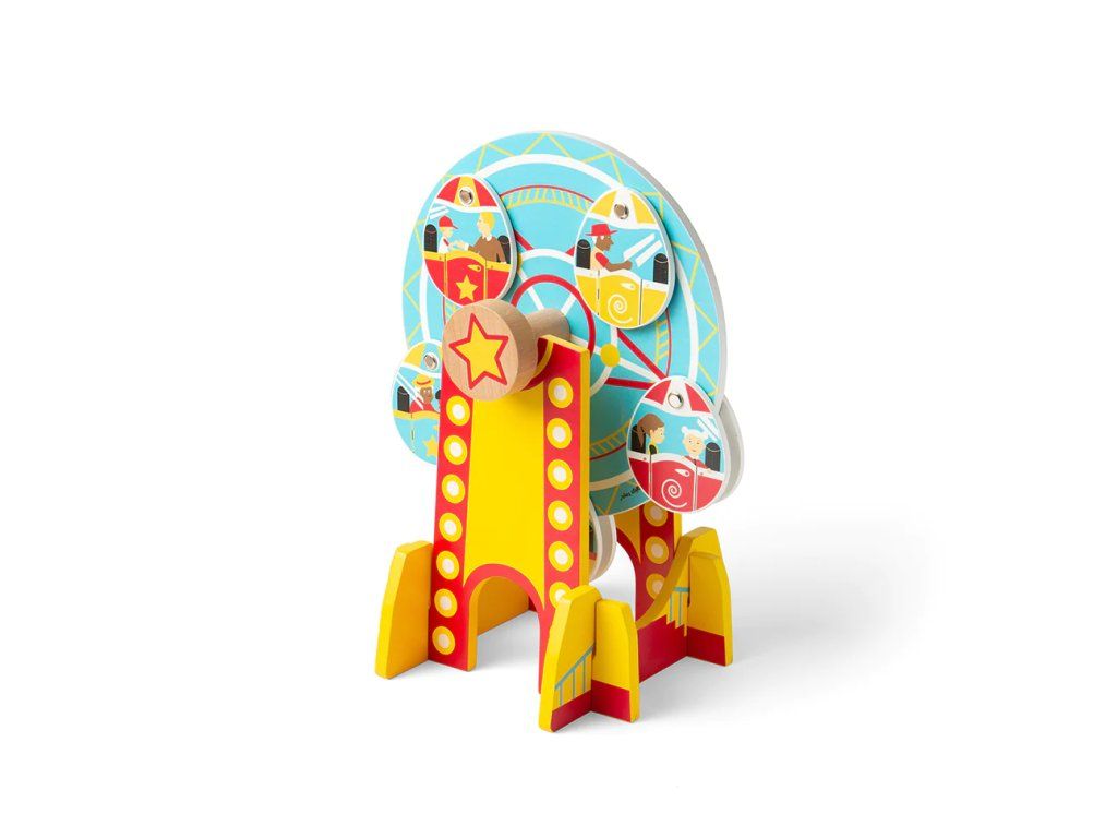 Otočte drevené ozubené koliesko a sledujte, ako sa návštevníci festivalu veselo točia na tejto zábavnej atrakcii!