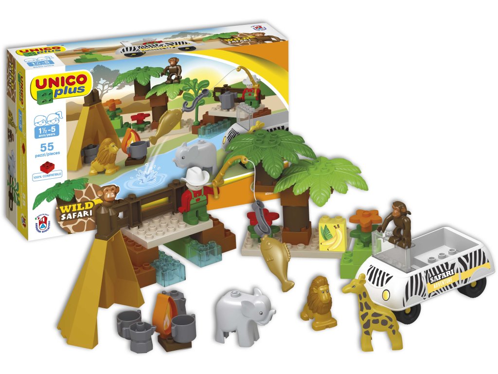 Stavebnica obsahuje žirafu, slona, leva, opičku, rybku a figúrku človeka, umožňuje deťom tvoriť safari scenérie a rozvíjať kreativitu, predstavivosť a jemnú motoriku.