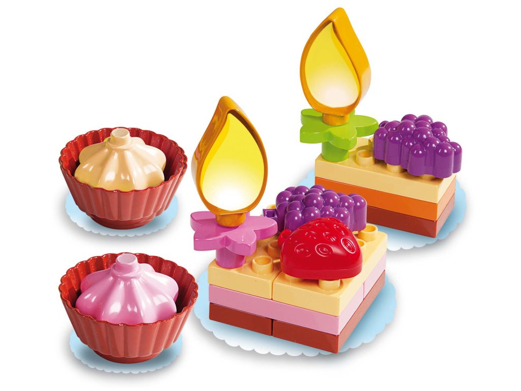 Stavebnica umožňuje deťom skladať farebné zákusky a tortičky, rozvíjať kreativitu, jemnú motoriku a predstavivosť pri hre.