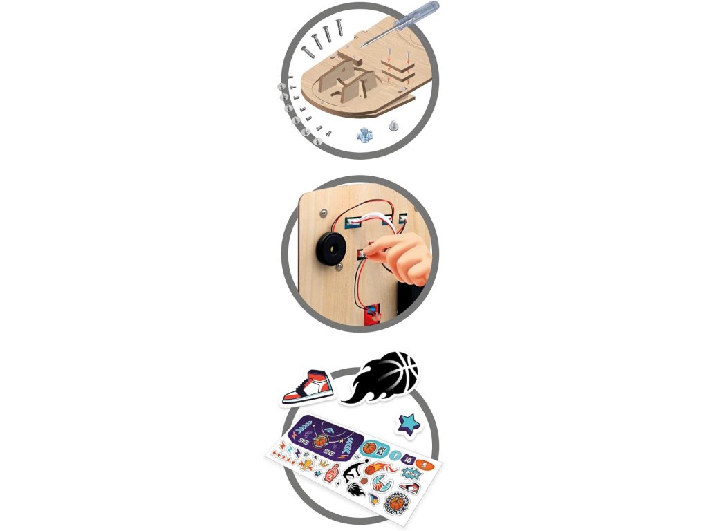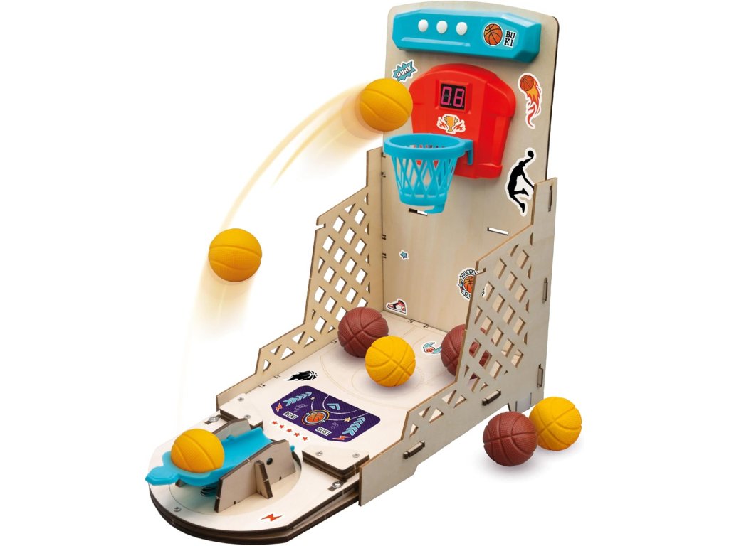 Zostav si vlastný interaktívny basketbalový kôš a hoď sa do súťaženia! Tento stavebný set spája praktické zručnosti (montáž bez nutnosti spájkovania) s elektronikou — výsledkom je malý stolný kôš s elektronickým displejom, zvukmi a počítadlom bodov, ktorý ocenia deti aj začínajúci hráči.