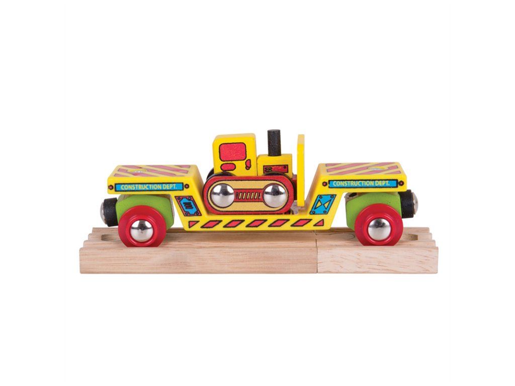 Táto krásna hračka má dvojité využitie. Deti si môžu hrať s buldozérom a zároveň ho nakladať a prepravovať na ťažkotonážnom vagóniku drevenej vláčikodráhy. Súčasťou balenia sú aj koľaje: 1 ks krátka koľaj BJT101 a 1 ks spojka BJT104!