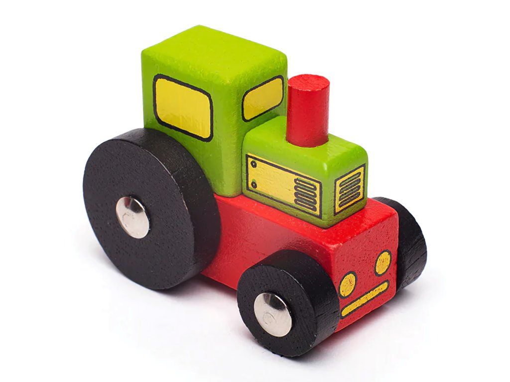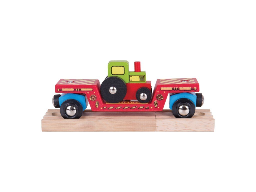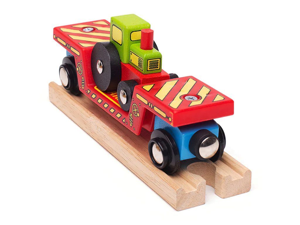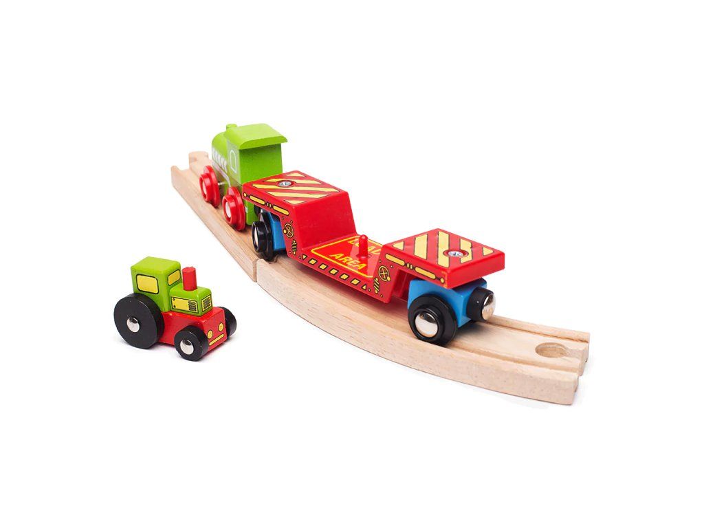 Táto krásna hračka má dvojité využitie. Deti si môžu hrať s traktorom a zároveň ho nakladať a prepravovať na ťažkotonážnom vagóniku drevenej vláčikodráhy. Súčasťou balenia sú aj koľaje: 1 ks krátka koľaj BJT101 a 1 ks spojka BJT104! Vagónik má magnetické spojky, ktoré umožňujú jednoduché prepojenie s ďalšími vagónikmi alebo lokomotívou, čím sa rozširujú možnosti hry a kombinovania.