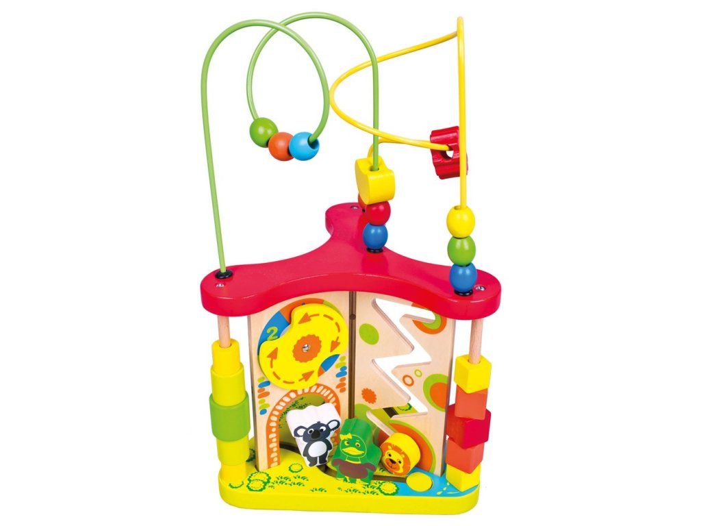 Mnohostranný labyrint v jasných farbách s korálikmi rôznych tvarov a veľkostí a posuvnými figúrkami zvieratiek prináša deťom bohatú a zábavnú hru.