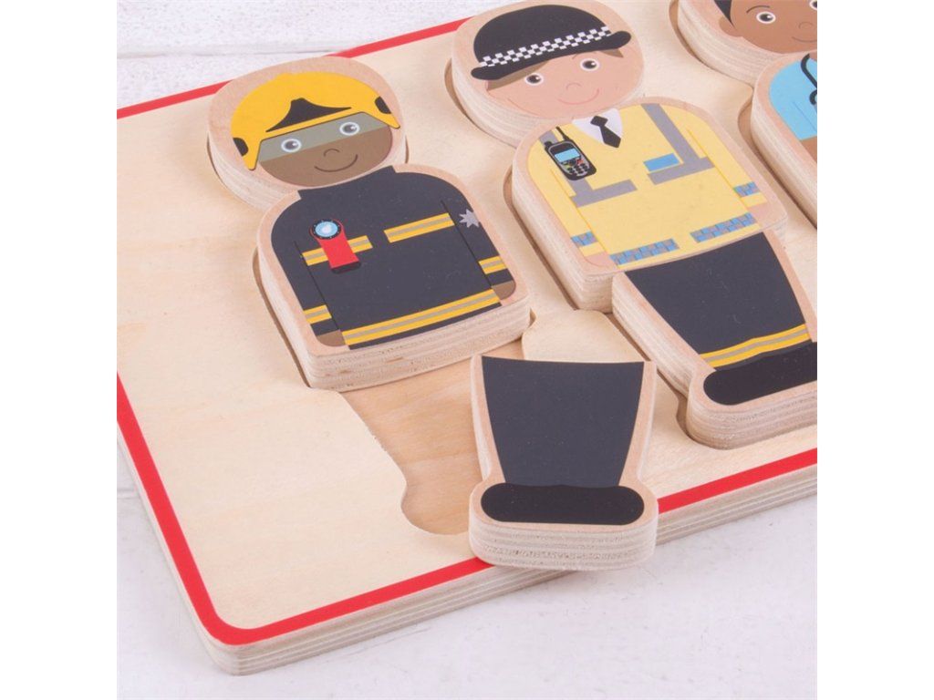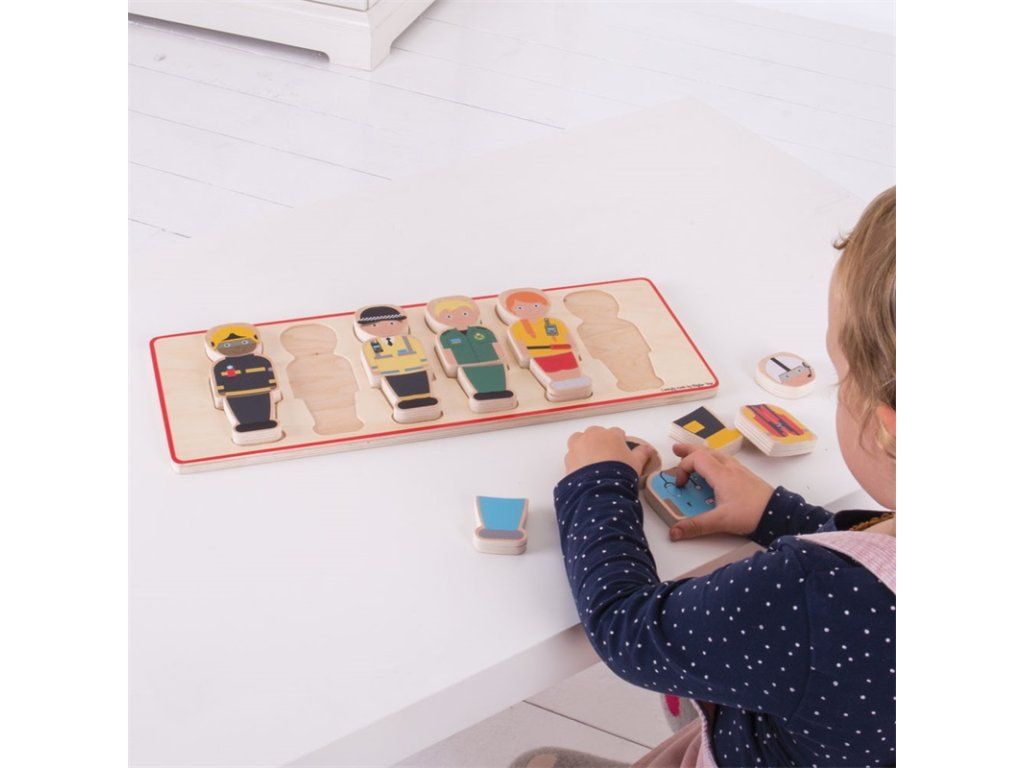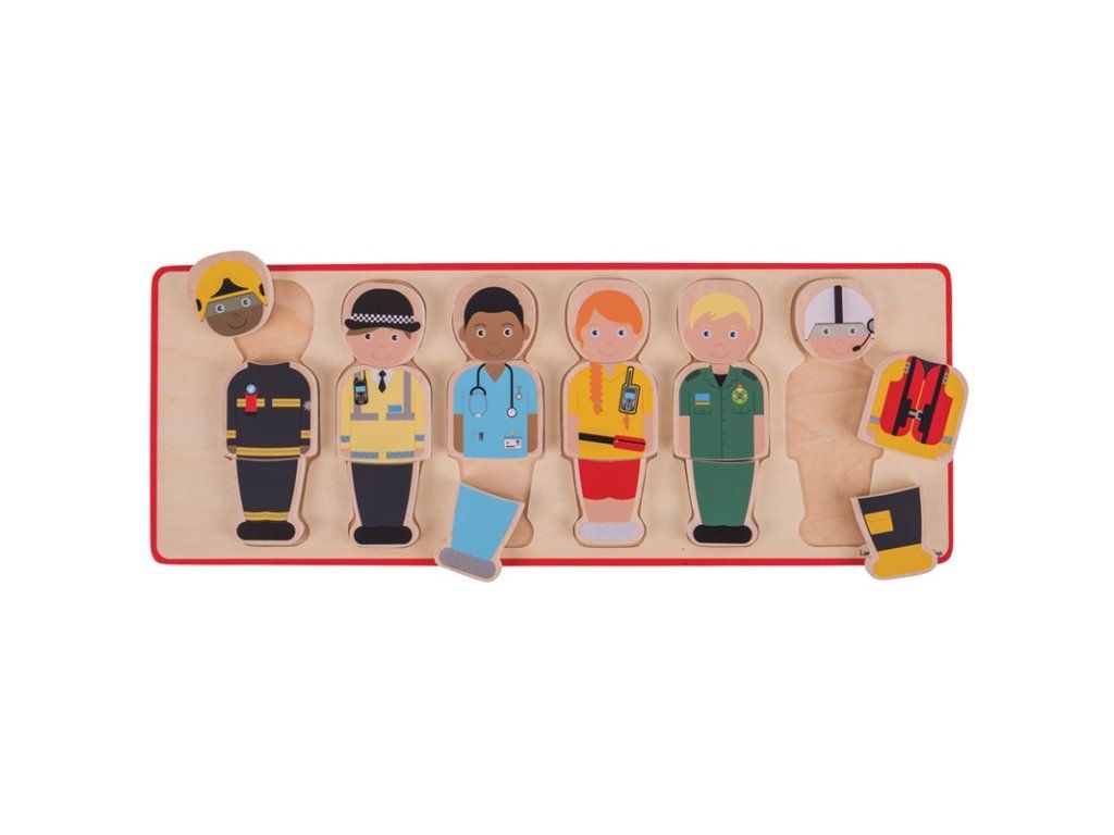 Táto robustná drevená skladačka obsahuje 6 záchranárov vrátane hasiča, policajta, lekára, pracovníka záchrannej služby a ďalších profesií. Každá postava sa skladá z troch drevených dielikov, ktoré deťom umožňujú kombinovať oblečenie jednotlivých postáv a vytvárať rôzne varianty.