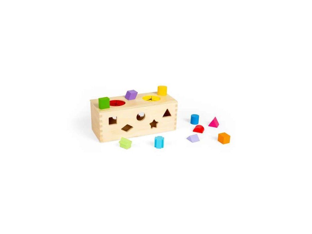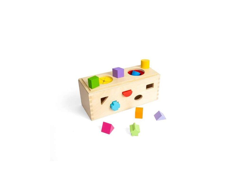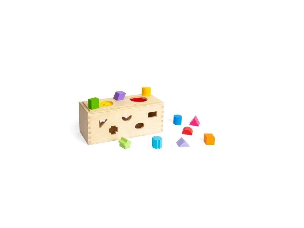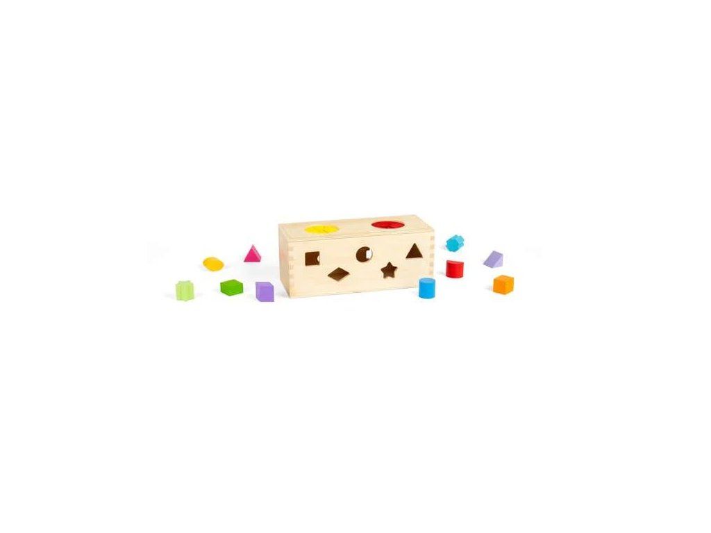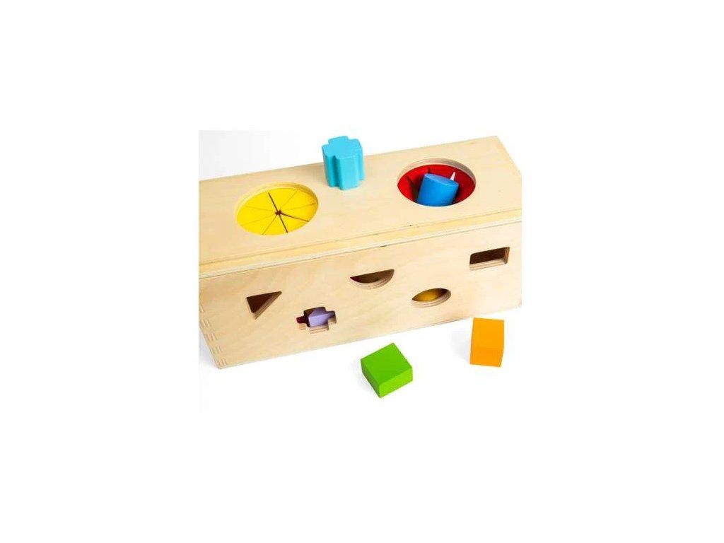 Úlohou dieťaťa je vložiť 10 tvarov do zodpovedajúcich otvorov na stenách drevenej krabičky. Do dvoch otvorov na hornej strane si deti vložia ruky, hmatom hľadajú tvar vo vnútri krabičky a následne ho vytiahnu, aby si overili správnosť svojho odhadu.
