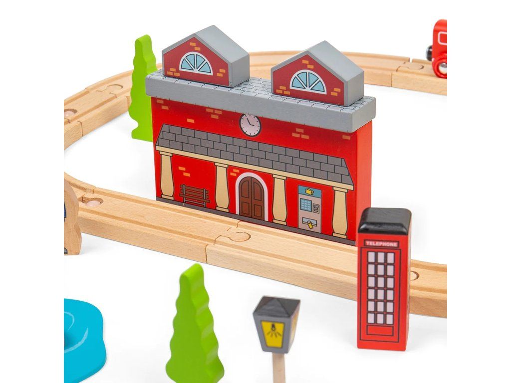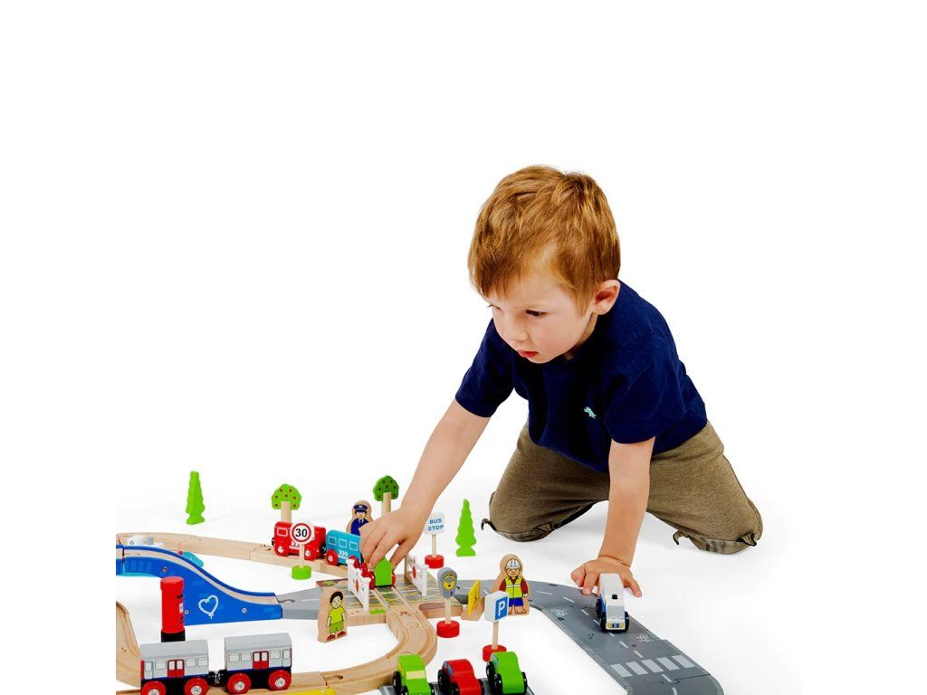 Tento rozsiahly drevený set ponúka veľa priestoru pre hru s predstavivosťou a obsahuje množstvo doplnkov, ktoré zaujmú deti. Vlaky a autá sa stretávajú na železničnom priecestí, cestujúci čakajú na vlakovej stanici a set dokonca obsahuje loď, ktorá prepraví pasažierov cez jazero. Spojenie koľají a ciest poskytuje nekonečné možnosti hry. Set je možné rozšíriť o ďalšie doplnky.